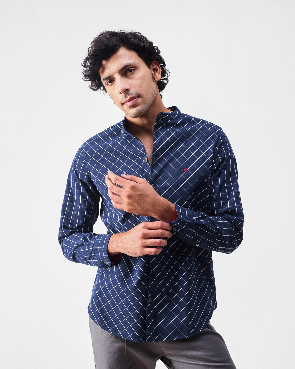 - Adorned in navy and white checks the shirt is simple yet striking.