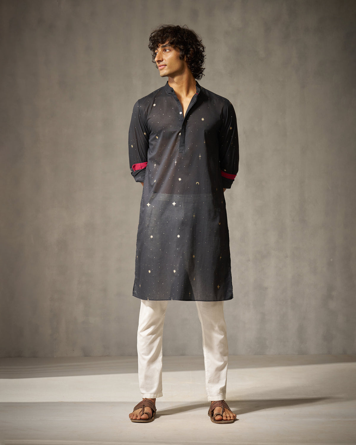 - A full-sleeve, classic bandhgala kurta for special times with all-over foiled moons stars.