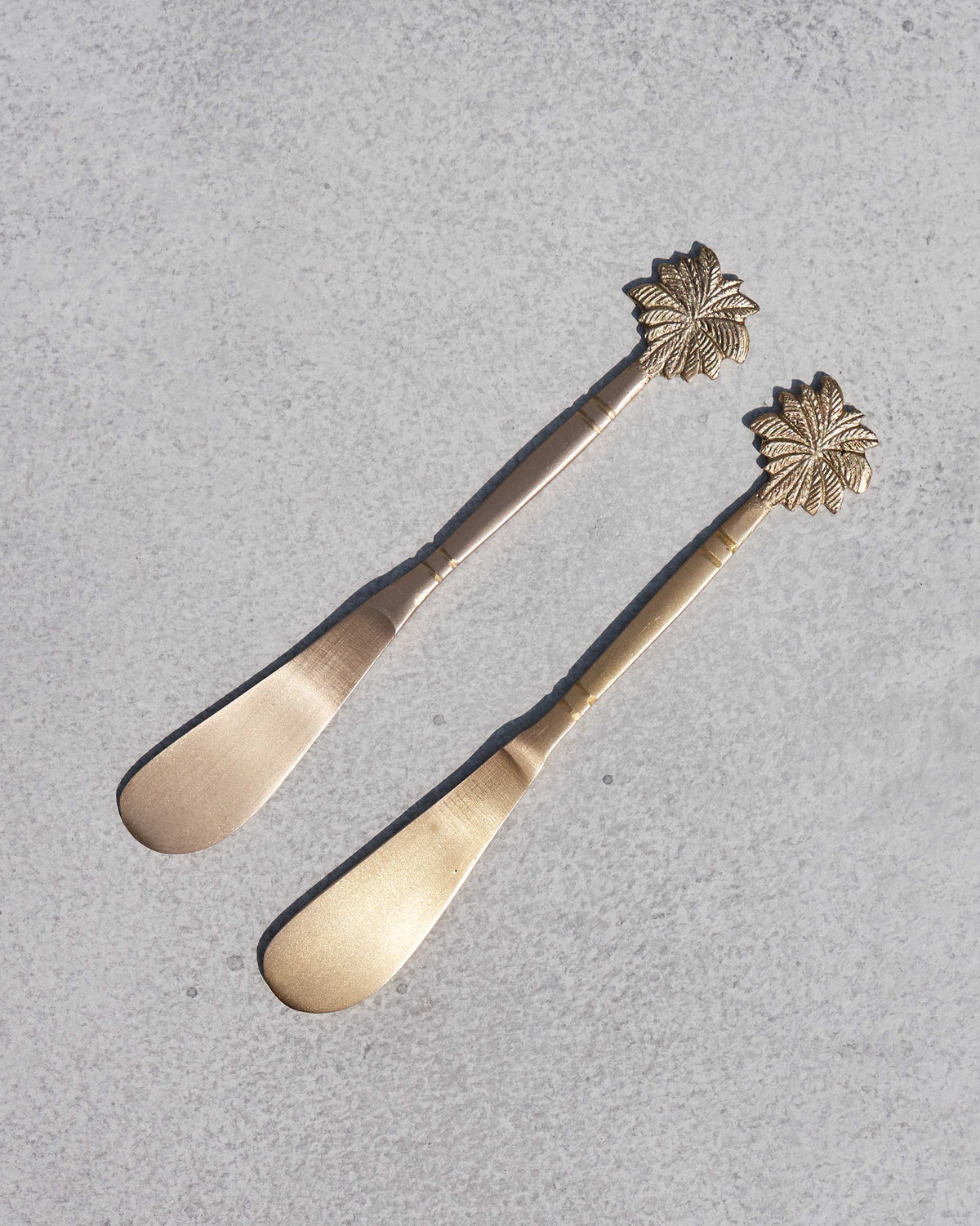 - Butter and jam knives carfted in brass, and featuring palm trees-the perfect island-inspired pieces for your cutlery drawer.