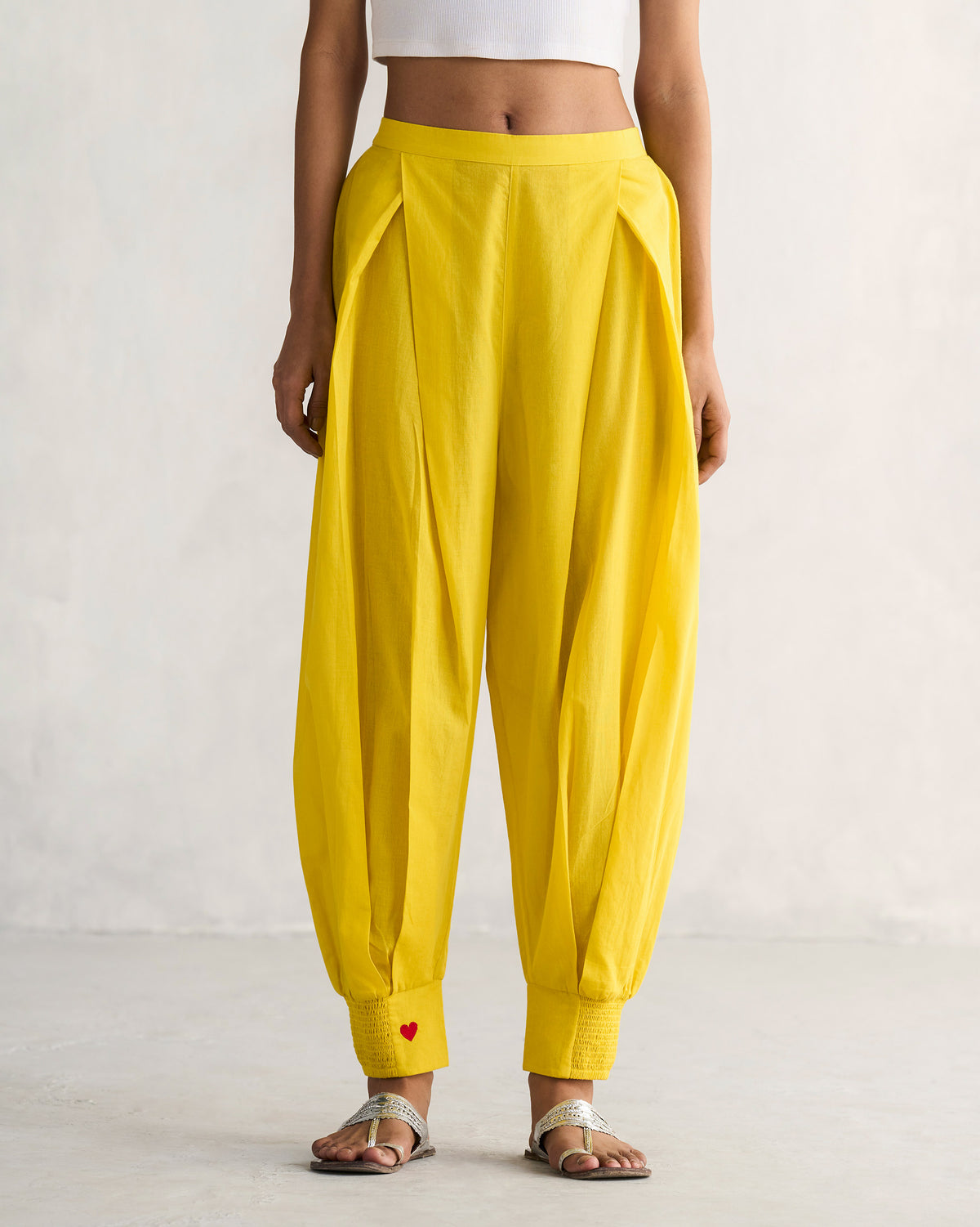 - With fantastic flare, the yellow Puff Pants playfully combine a narrow fit with cheeky pocket details to keep you feeling bright and breezy.