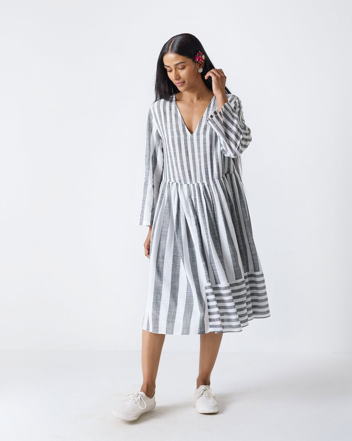 - The Rainy Season Dress in our signature charcoal and white stripes is a blend of bold design and effortless elegance. Made from 100% yarn-dyed cotton, the dress features a combination of thick and thin stripes in charcoal and white, creating a dynamic, layered look.