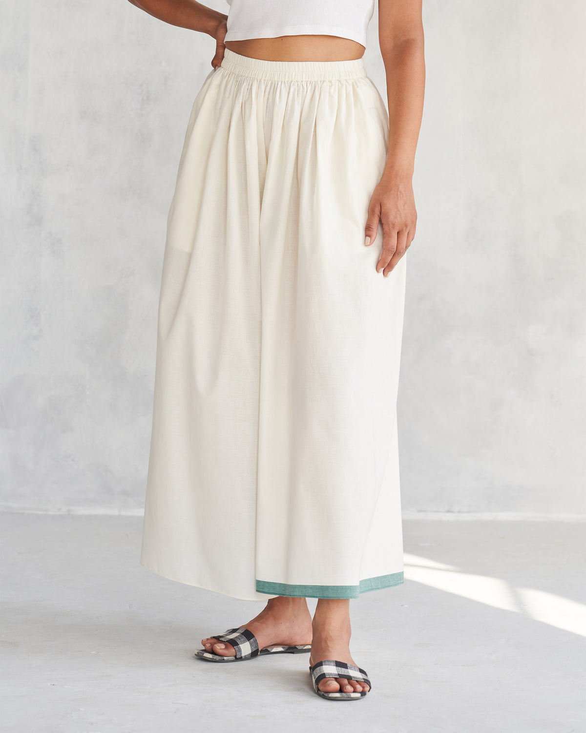 - They stand out in ivory fabric contrasted by black and green selvedge detailing, accented with a green flower embroidery on the left pocket.