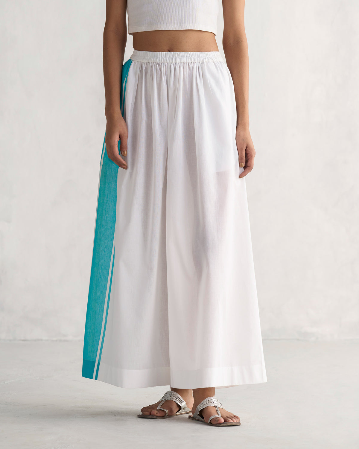 - The comfortable Soto Flared Pants in white add a pop of colour to your outfit with the aqua and yellow selvedge on the front seam, our nod to sun-kissed waves and playful puddles.