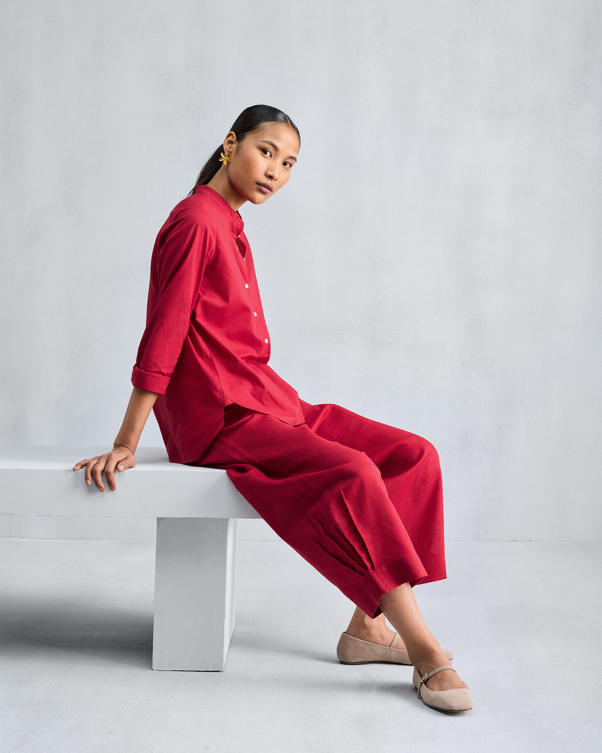 - A set of two of our signature styles, the Mandarin Collar Top and Serene Pants in red.