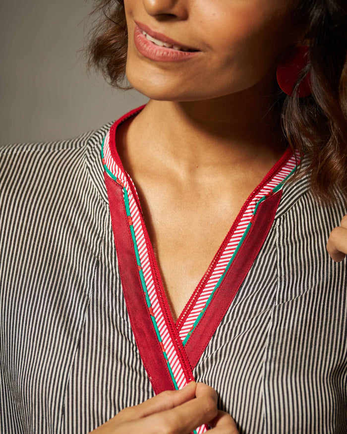 Aliyah Tie Kurta - Black & Ivory Stripes