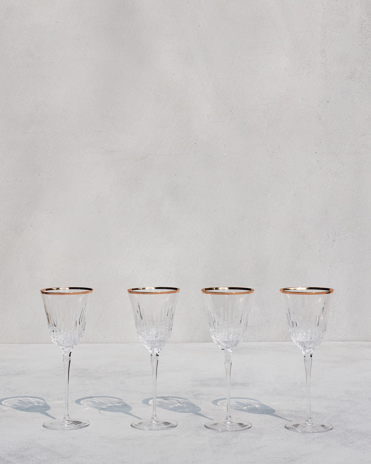 - This set of 4 glasses is crafted from glass and features a contemporary design and gleaming copper rim.