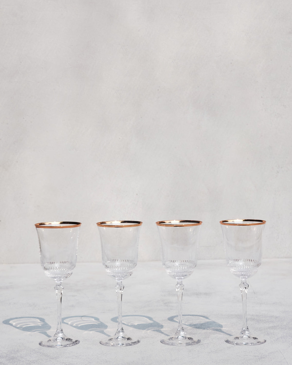 - This set of 4 glasses is crafted from glass and features a contemporary design and gleaming copper rim.