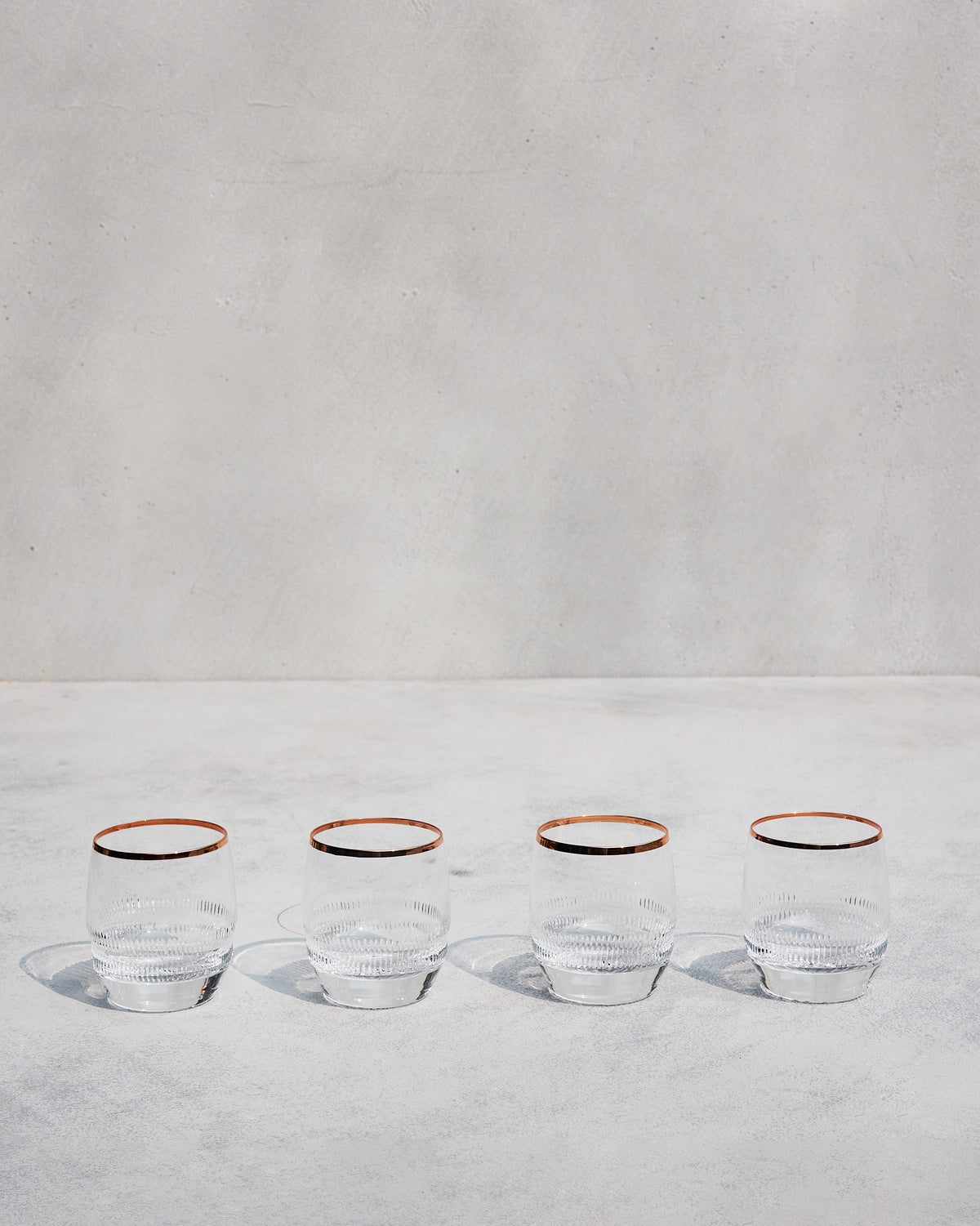 - This set of 4 glasses is crafted from glass and features a contemporary design and gleaming copper rim.