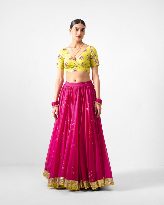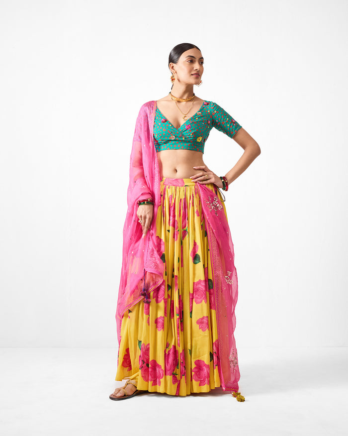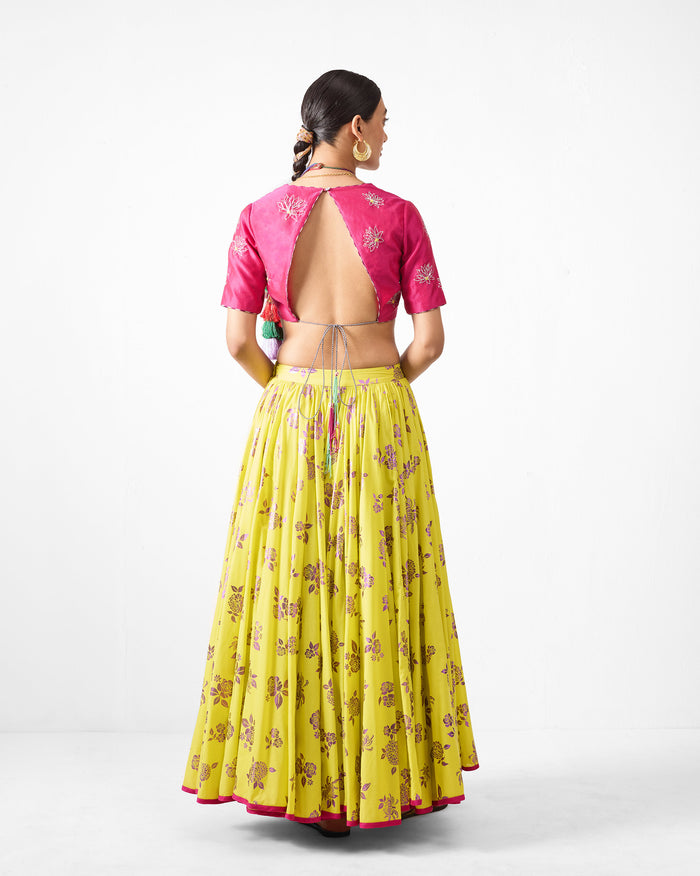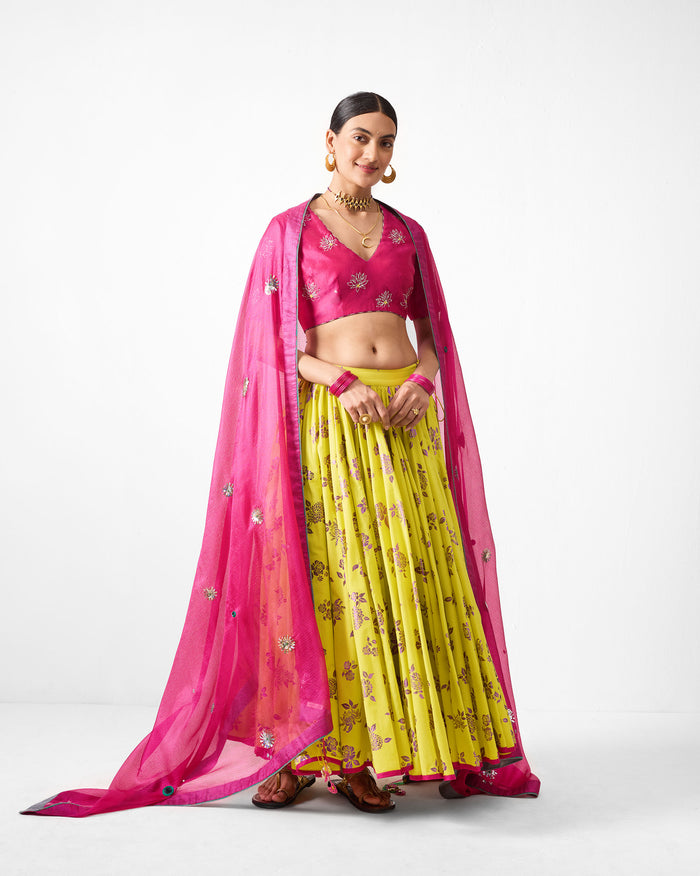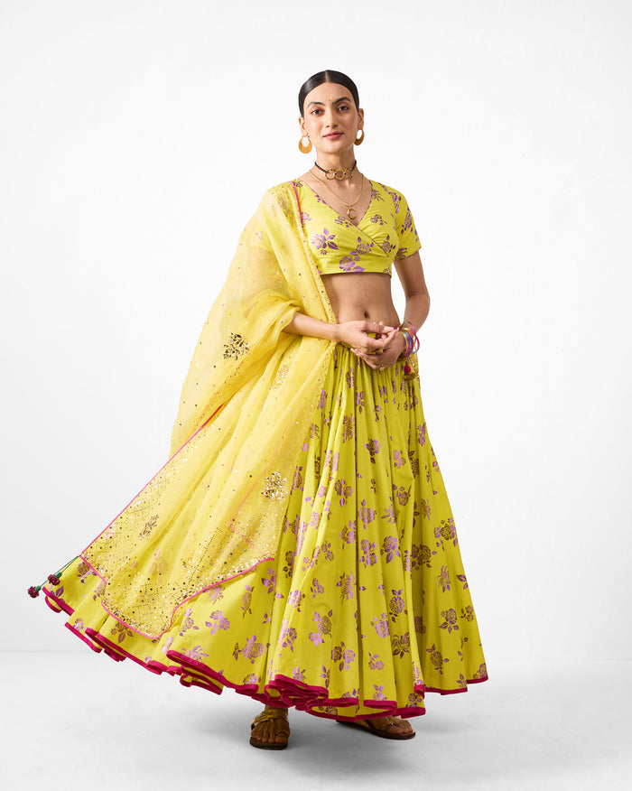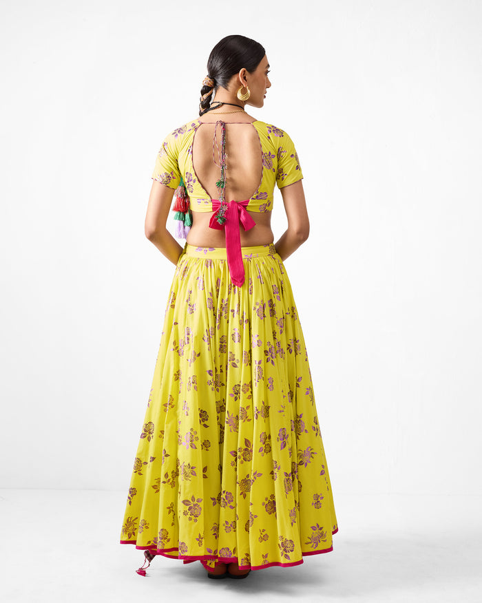 V-Neck Flared Kurta - Chartreuse & Gold Printed