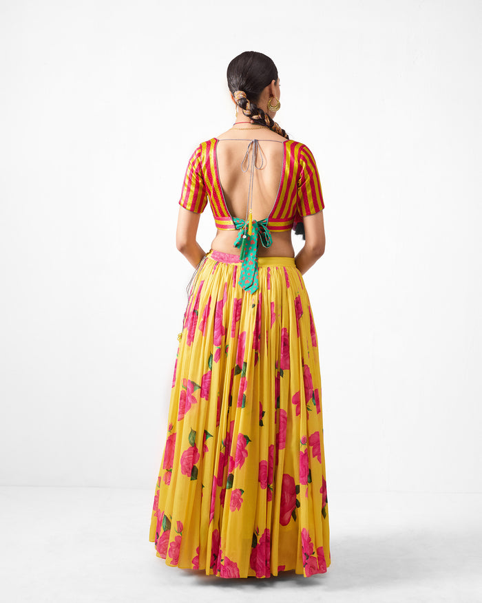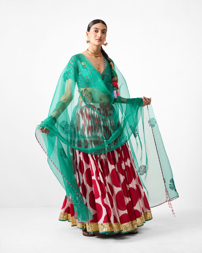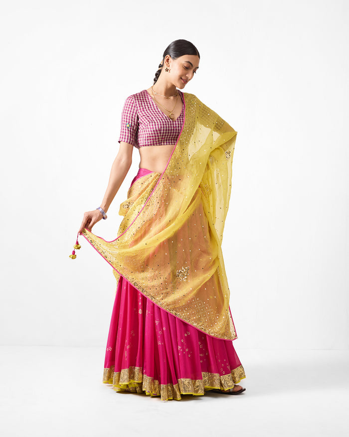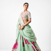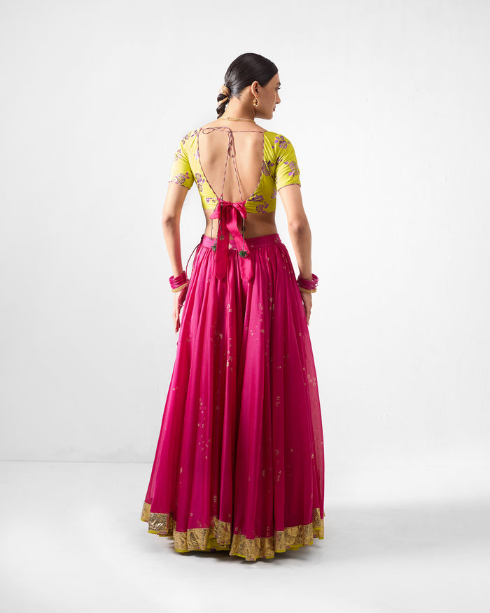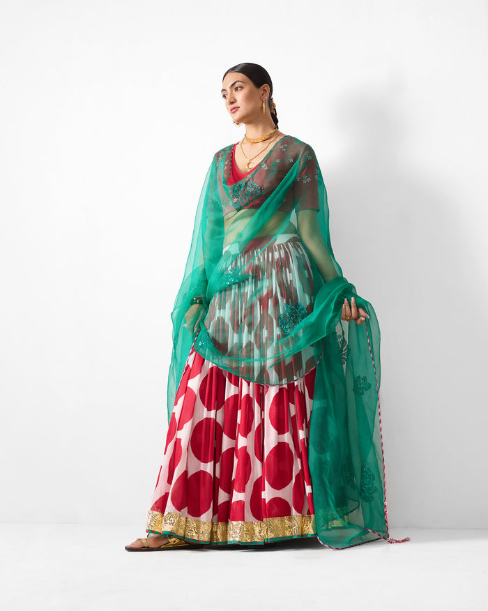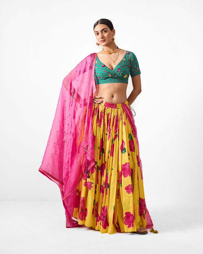 V-Neck Flared Kurta - Chartreuse & Gold Printed