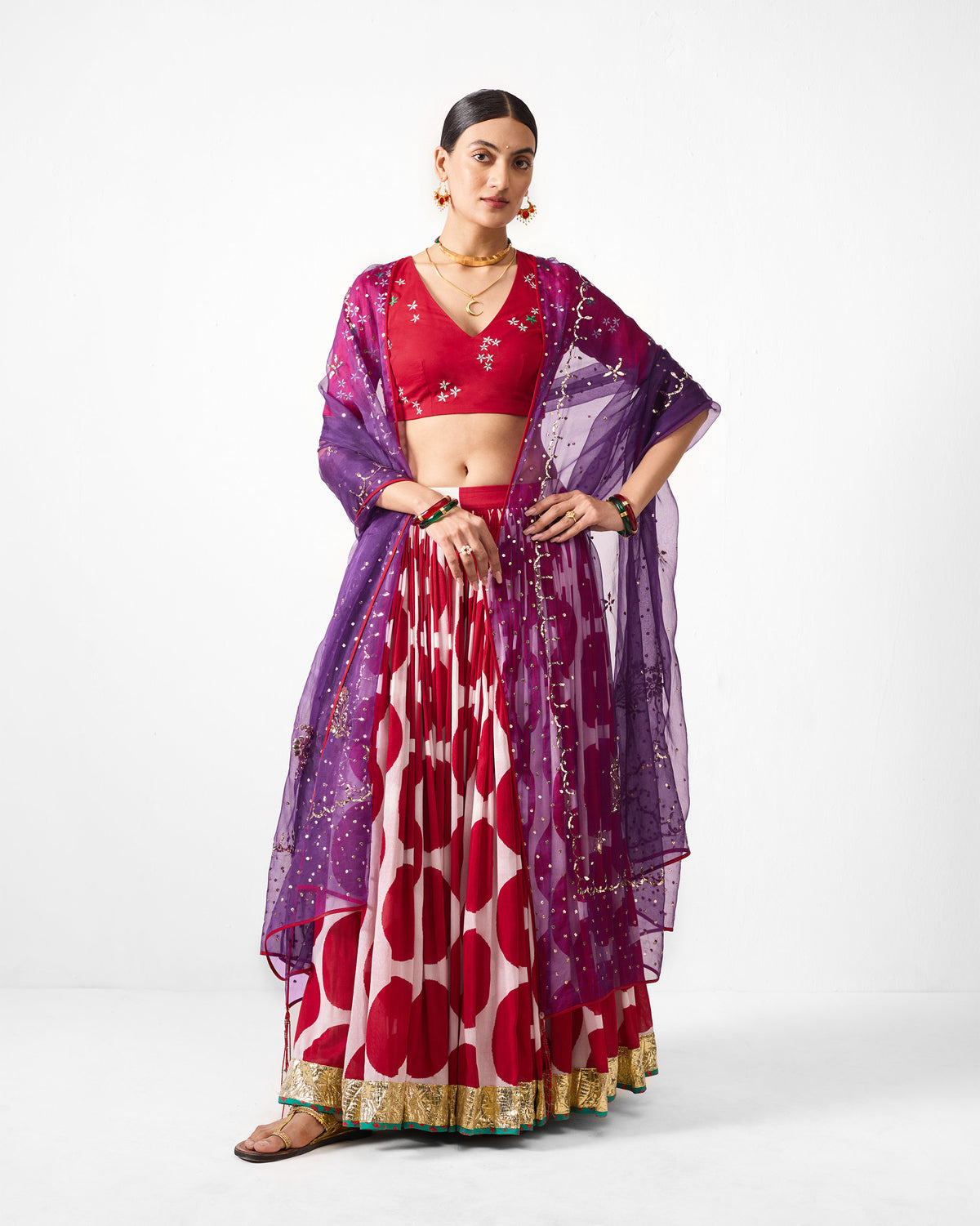 • This set includes the Bindu Skirt in a red and ivory print, the Inaaz Blouse in red embroidery, and the purple embroidered Chandni Dupatta. A perfect set for a cocktail.