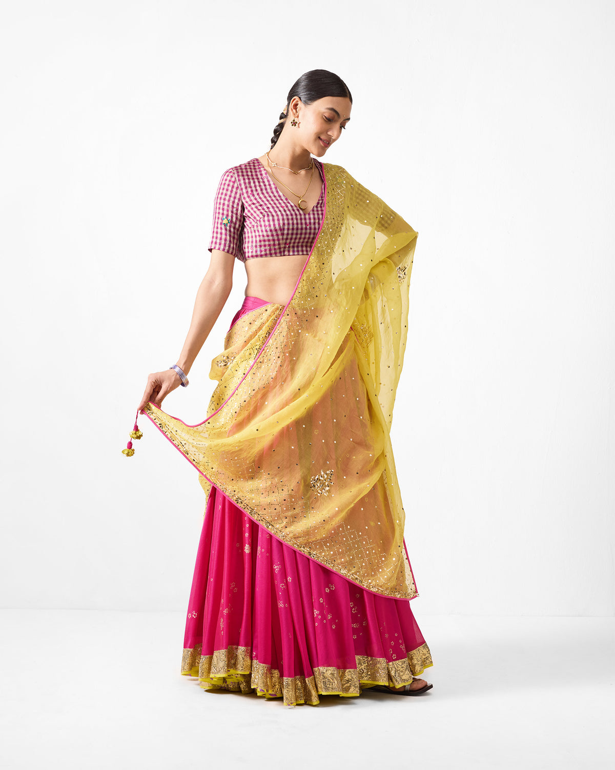 - This set includes the Saaya Skirt in fuchsia and gold print, the Dori Blouse in purple and silver embroidery, and the yellow embroidered Anya Dupatta. A perfect set for being part of the baraat.