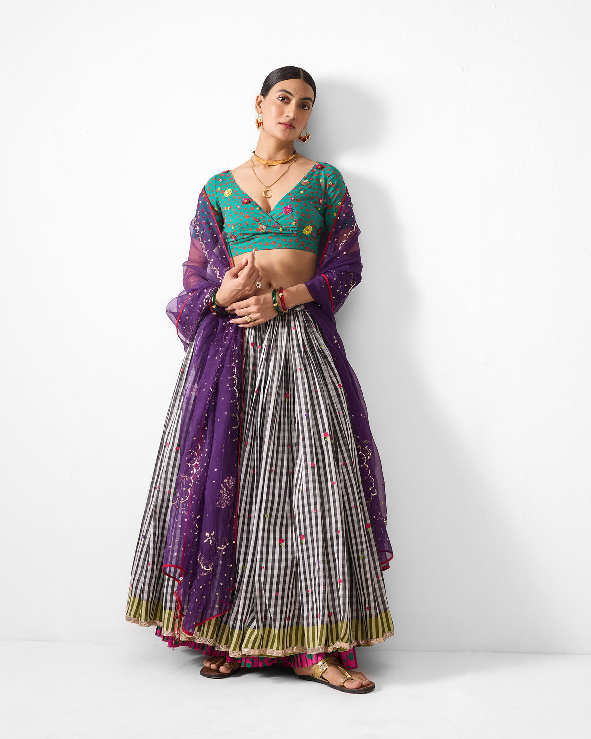 - This set includes the Sitara Skirt in black and white embroidery, the Saanjh Blouse in red and green embroidery, and the purple embroidered Chandni Dupatta. Perfect for a mehendi.
