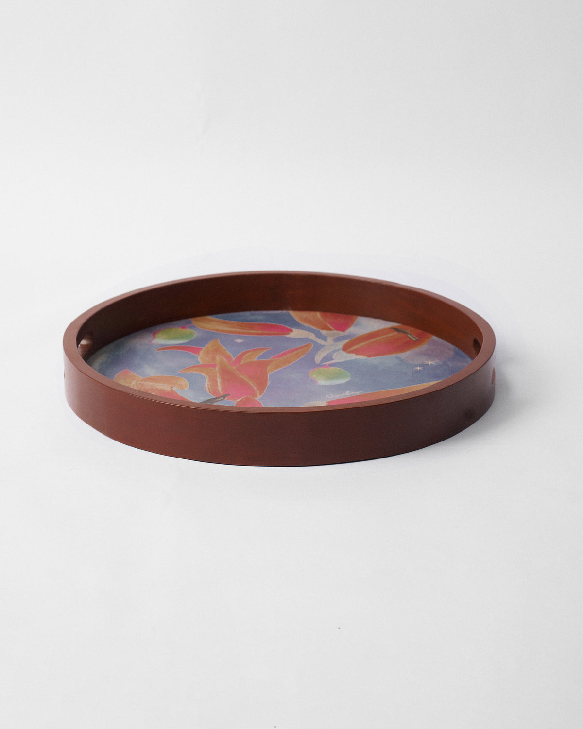 - Inspired by the vivid bloom of the palash flower, the Palash Round Tray brings a burst of colour to your table. With its bright digital print on wood, it's made to stand out and lift any setting.