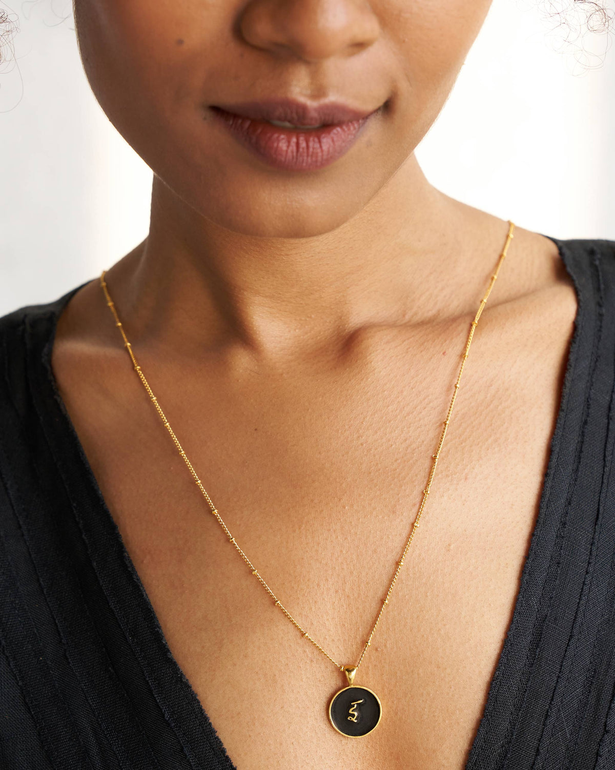 - With handwritten Devanagari akshar on one side and Roman letter on the other, this gold-plated charm with black enameling is the ideal gift for when you want to make it personal.
