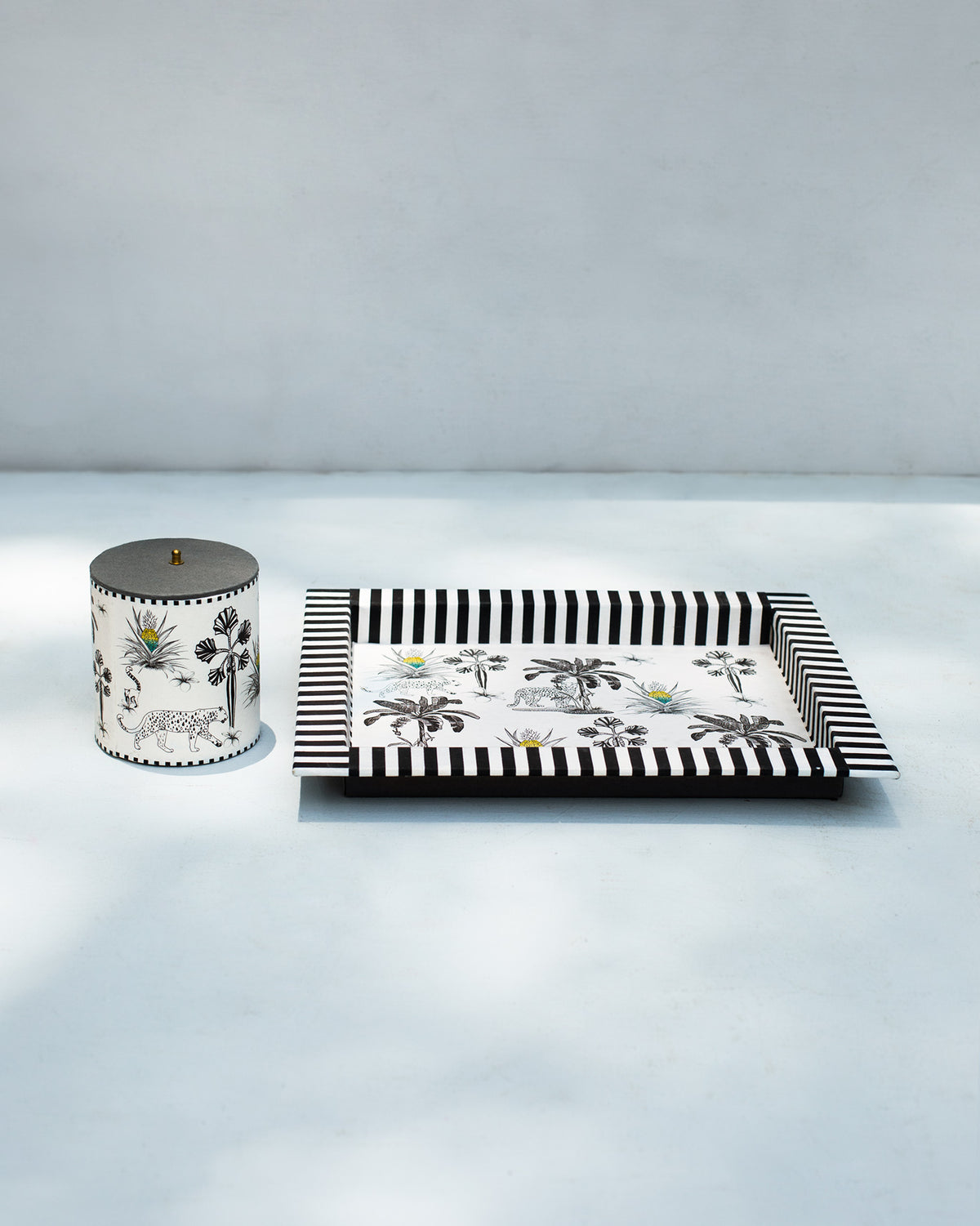 - For an organised work desk, a curated set with a tray and container, complete with botanical prints and crafted in innovative recycled paper.