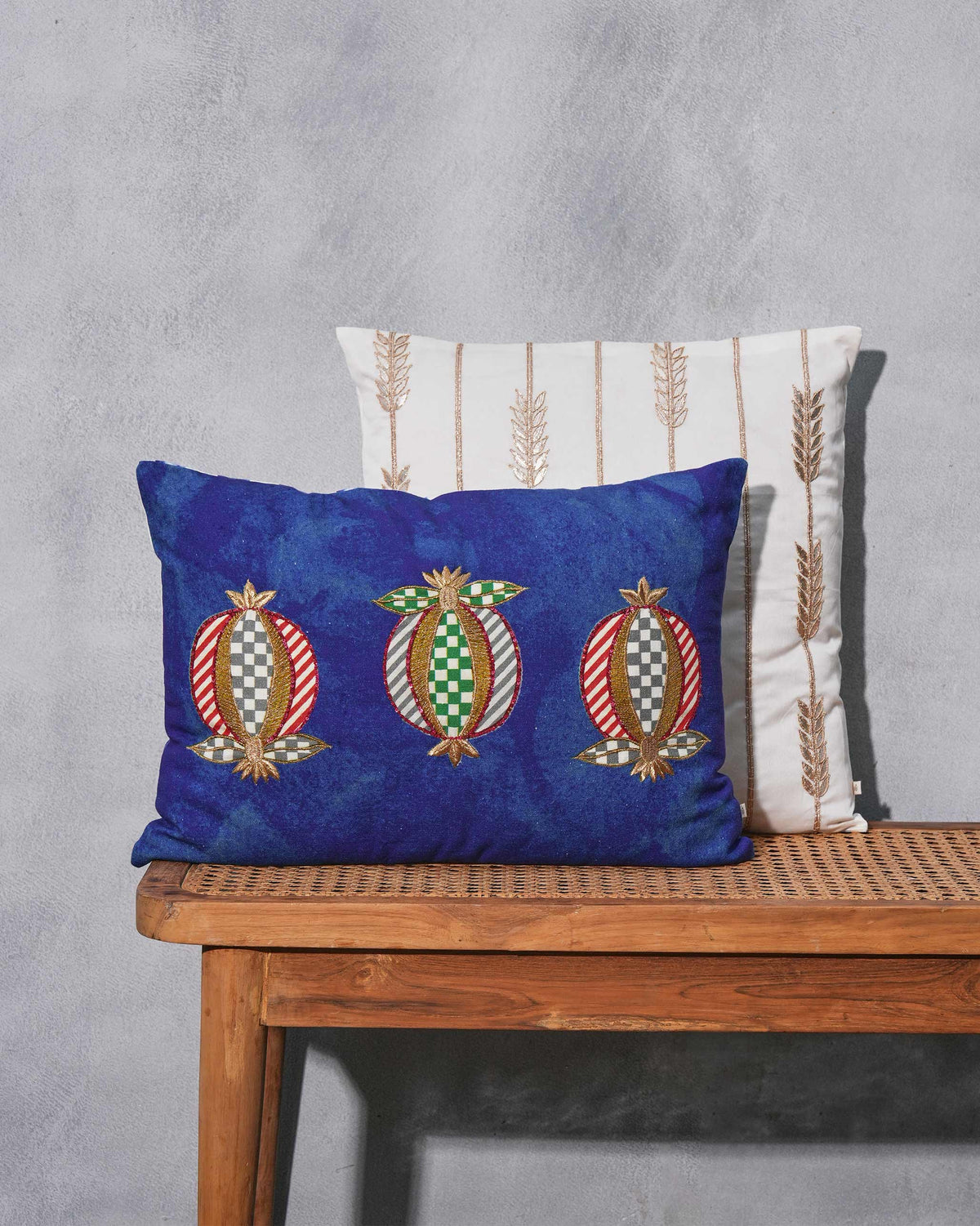 - The Anar Checks Cushion Cover features three stylised motifs of pomegranates, a symbol of hope and abundance in the region, celebrating the vibrant spirit of Morocco.