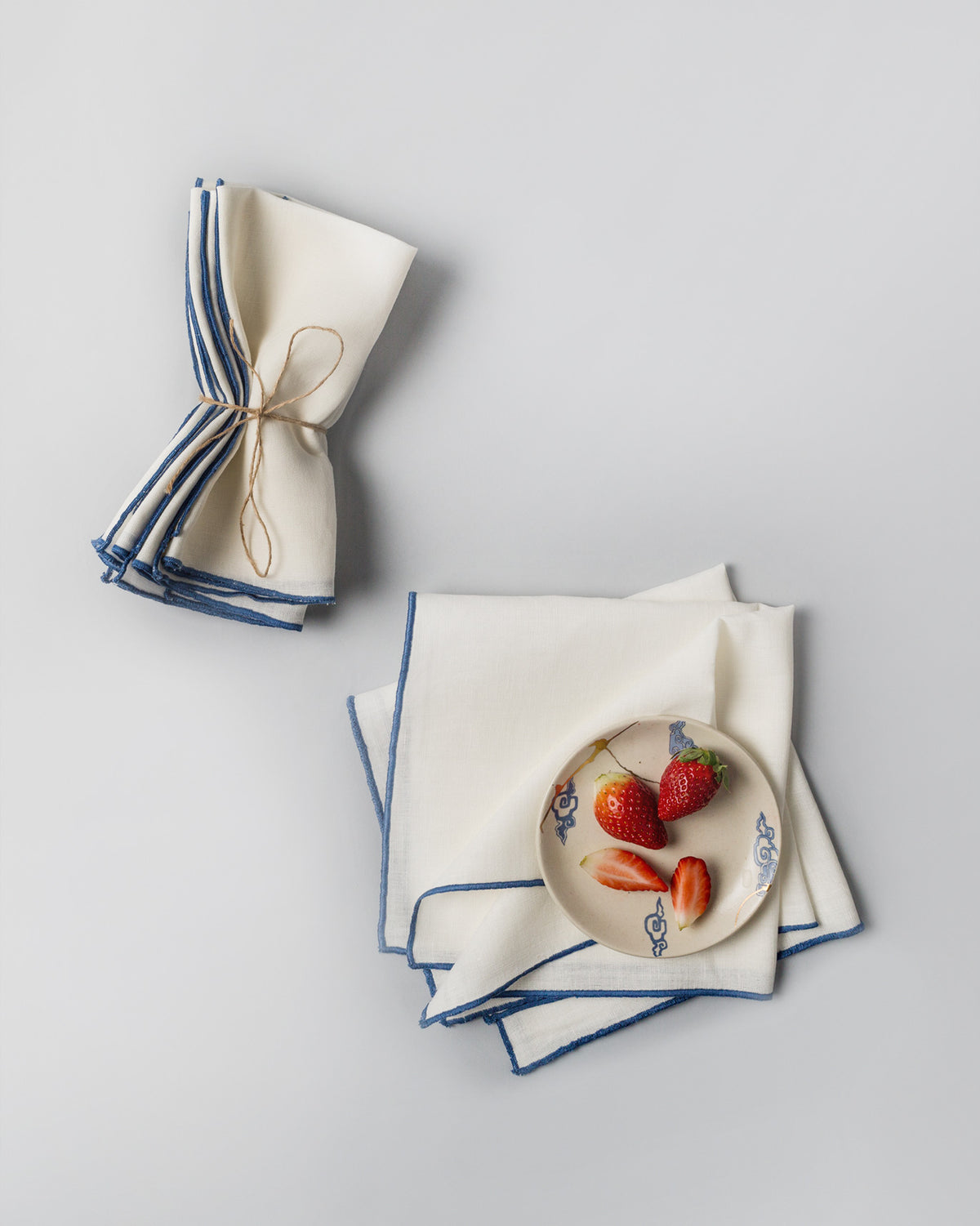 - Our Aozora dinner napkins in clean white come with faded cobalt edging and will sit well with almost any serveware you dish out.