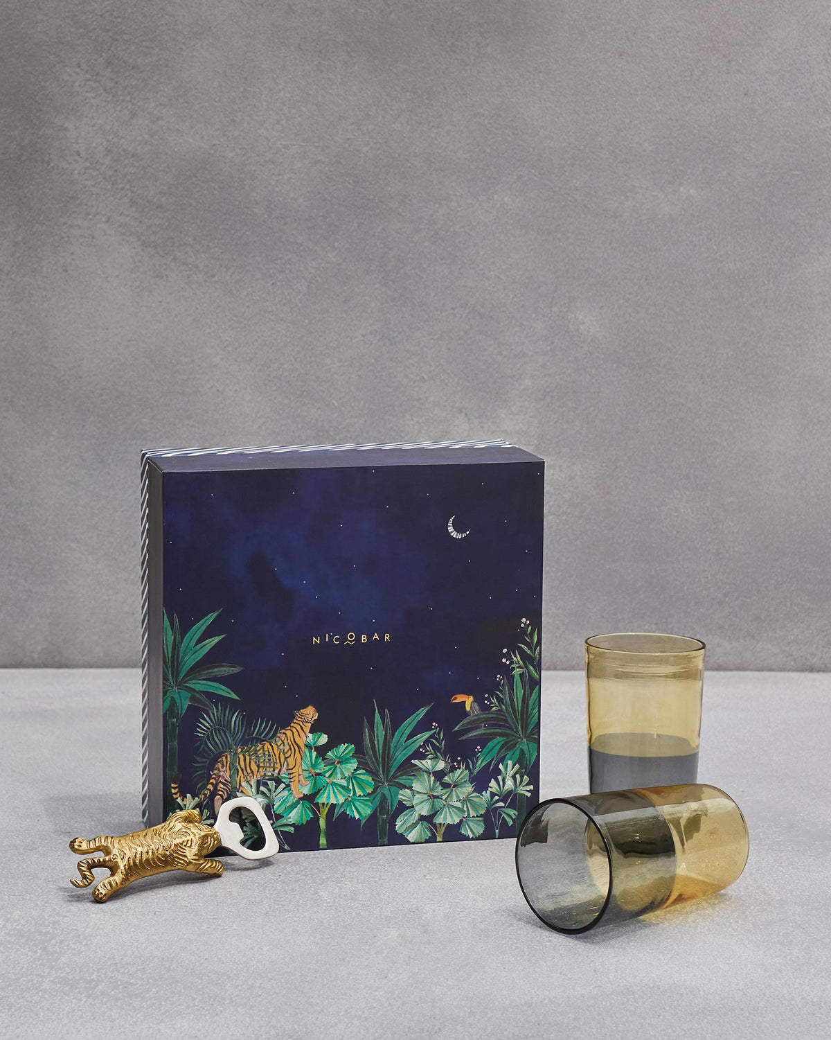 • Perfect for beer lovers, give the gift of ales with the Asfar Gift Set. The set comes with two tumblers and a bottle opener, all with motifs from our travels to Morocco.