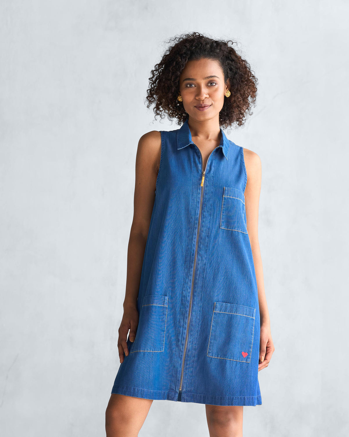 • Polished and easy, this enzyme-washed 100% cotton denim dress is elevated by the Nico heart embroidered on the pocket, a classic collar, and a brass metal zipper.