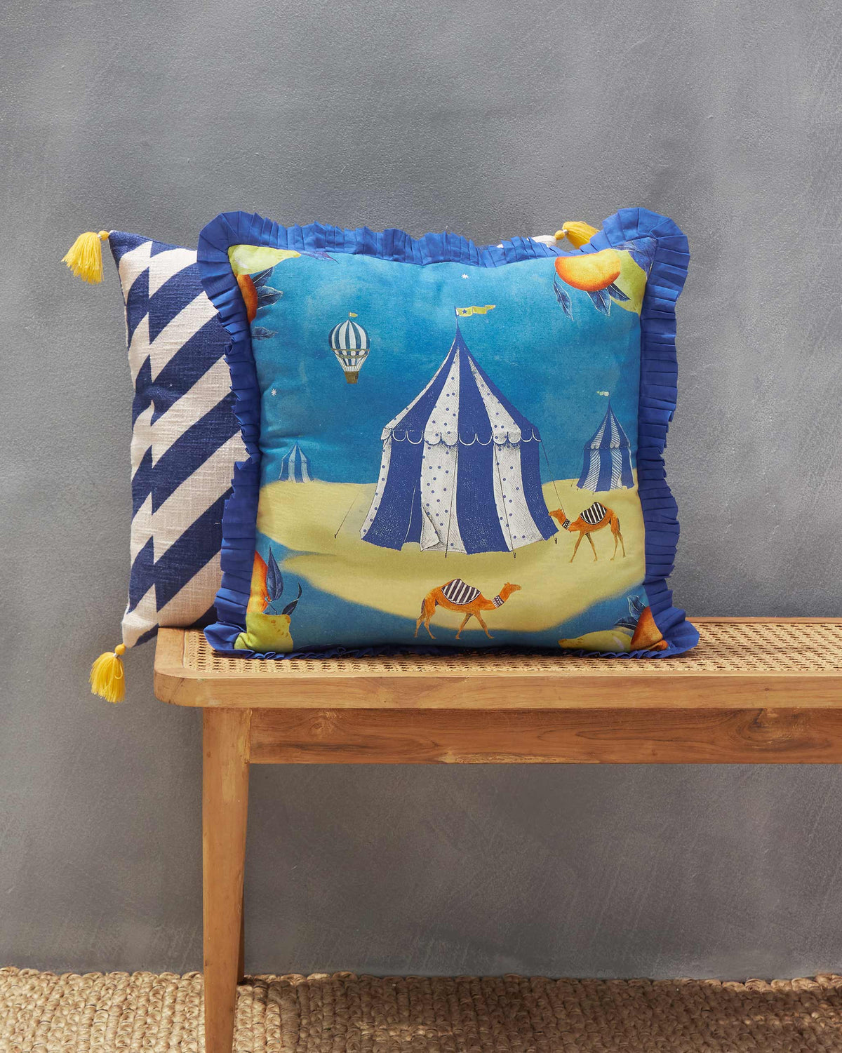 • The colours and textures of Morocco, the deep blues, dreamy tents, traipsing camels and the flurry of tangerine and lemon all around, inspires the Azraq Cushion Cover.