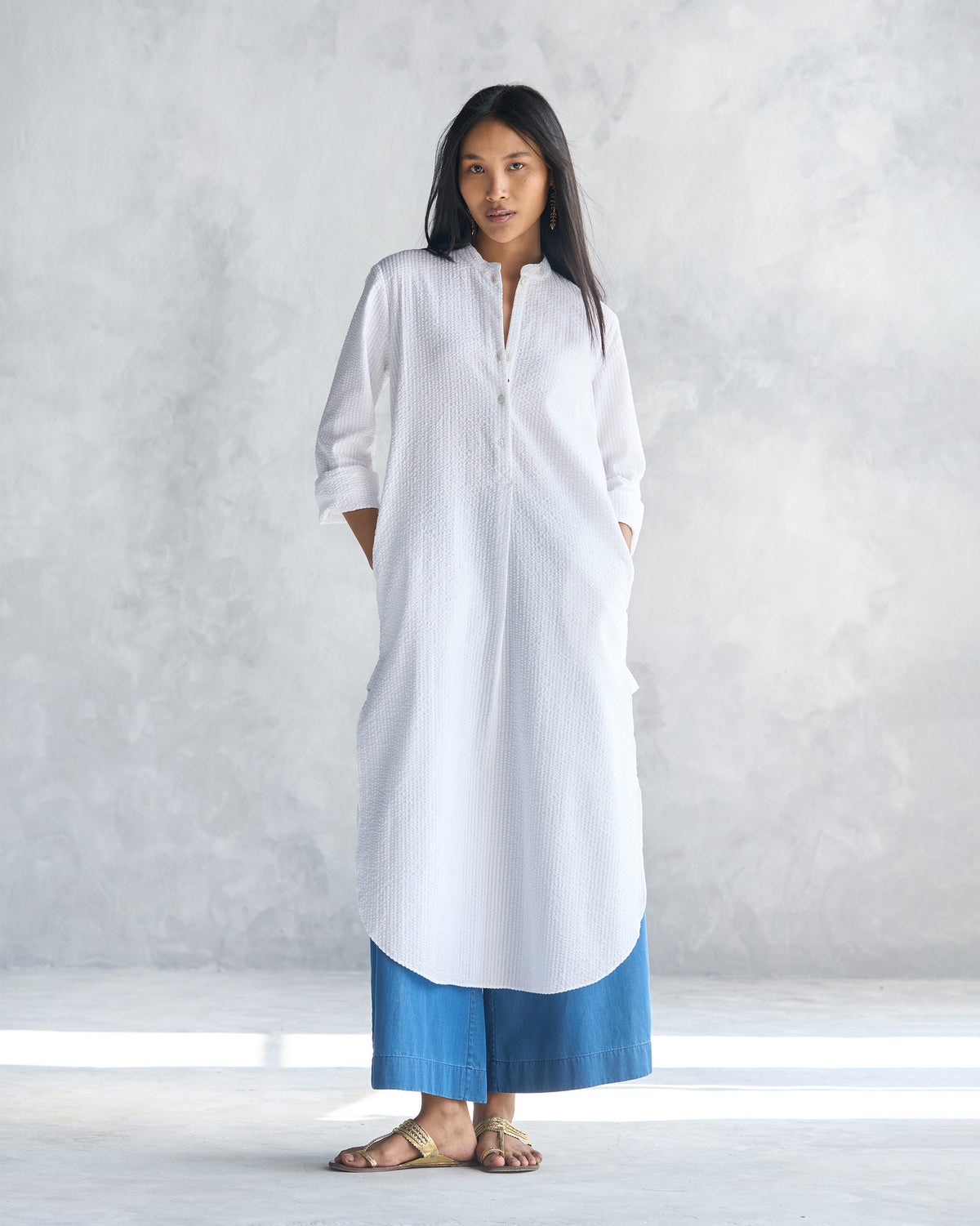 Basic Long Length Kurta - White Seersucker