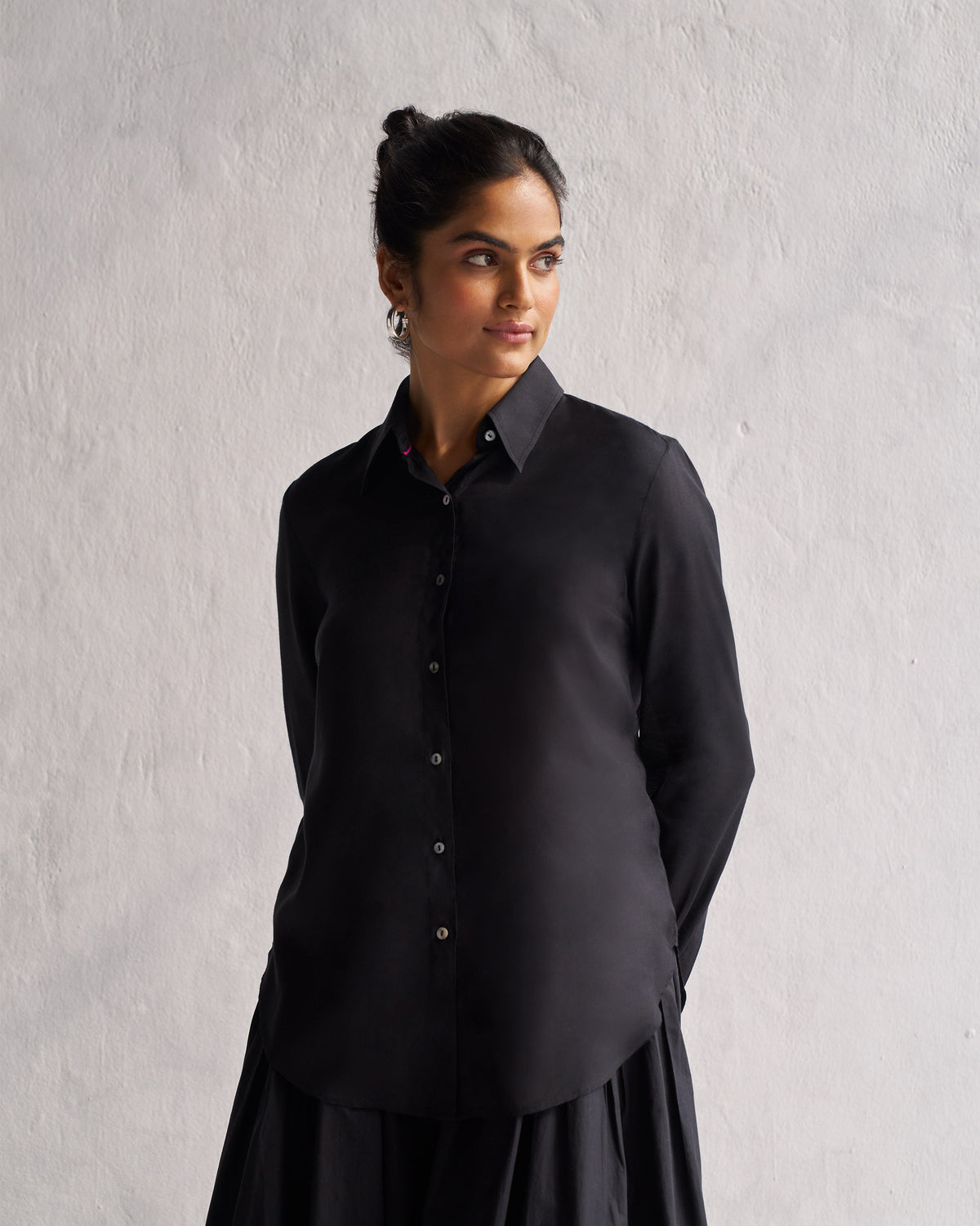 - No wardrobe is complete without a classic black shirt. Ours features a collared neck and comes in a super-soft breathable fabric, good to layer or wear as is. You’ll find a magenta heart embroidered at the back. Style it with a silver choker and thin silver bangles to add some shine.