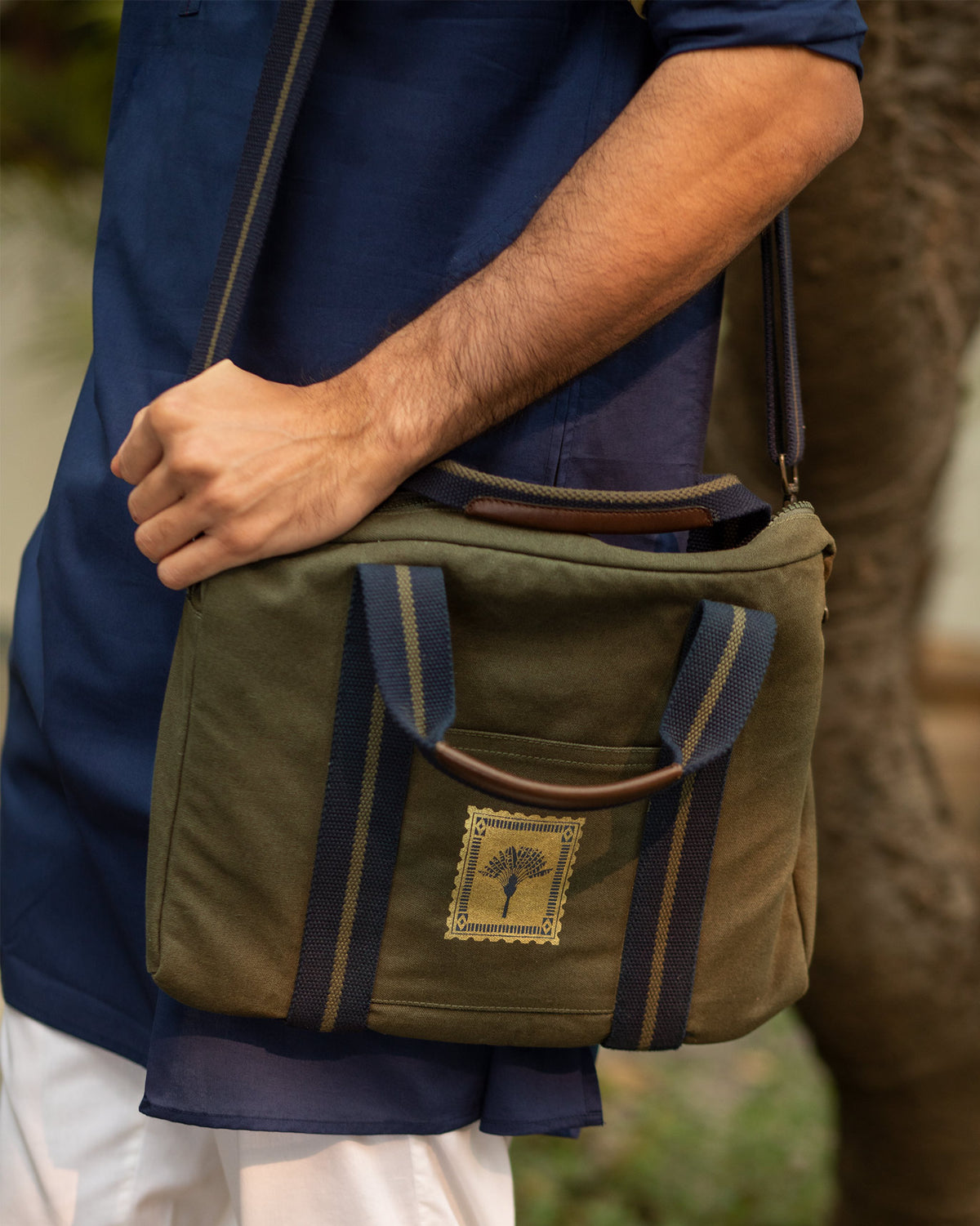 - This laptop case comes in an olive canvas fabric with an icon printed at the centre and peacoat webbing