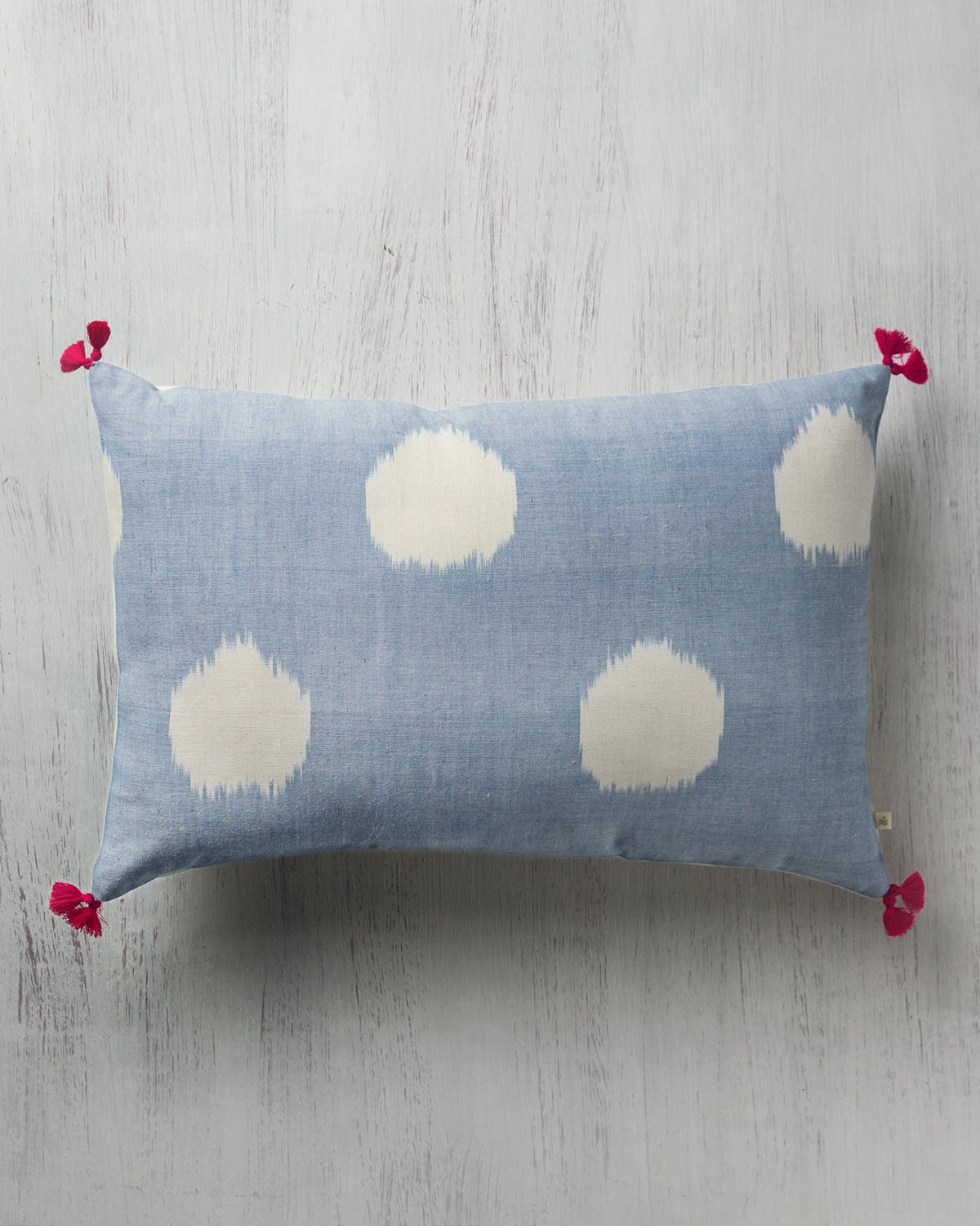 - A soft blue base peppered with big white polkas and yellow pom poms to add a little flourish, this cushion is perfect to fill out a cosy corner in your home