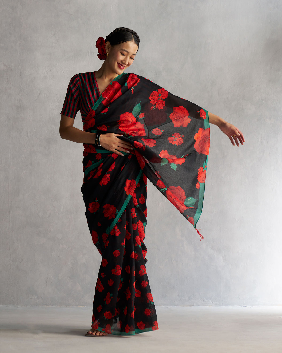 • Welcome festive season with a little flourish and a sari that's equal parts chic and glam. It features a gorgeous print of roses all over against a black background for an added statement.