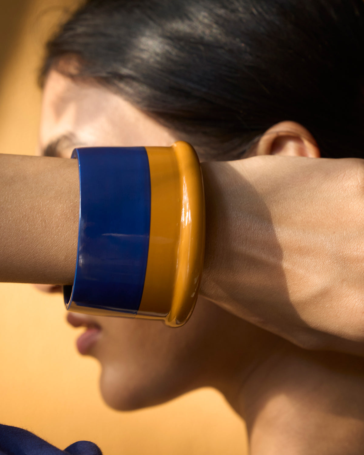 - Cast in wood and plated in ochre and blue, these bangle is the chicest piece to add sparkle to your outfit