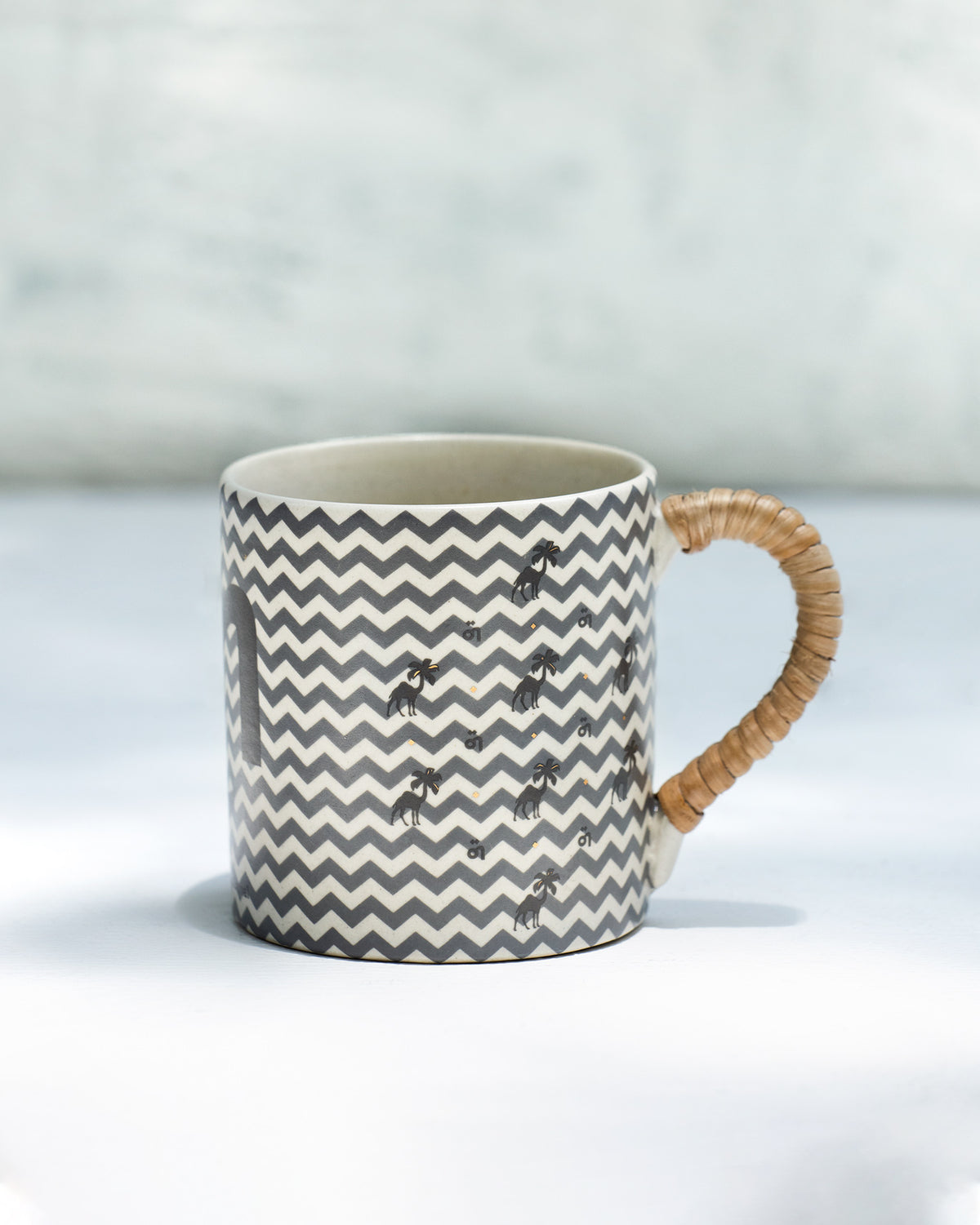 - A grey & gold stoneware mug with a natural wildgrass handle