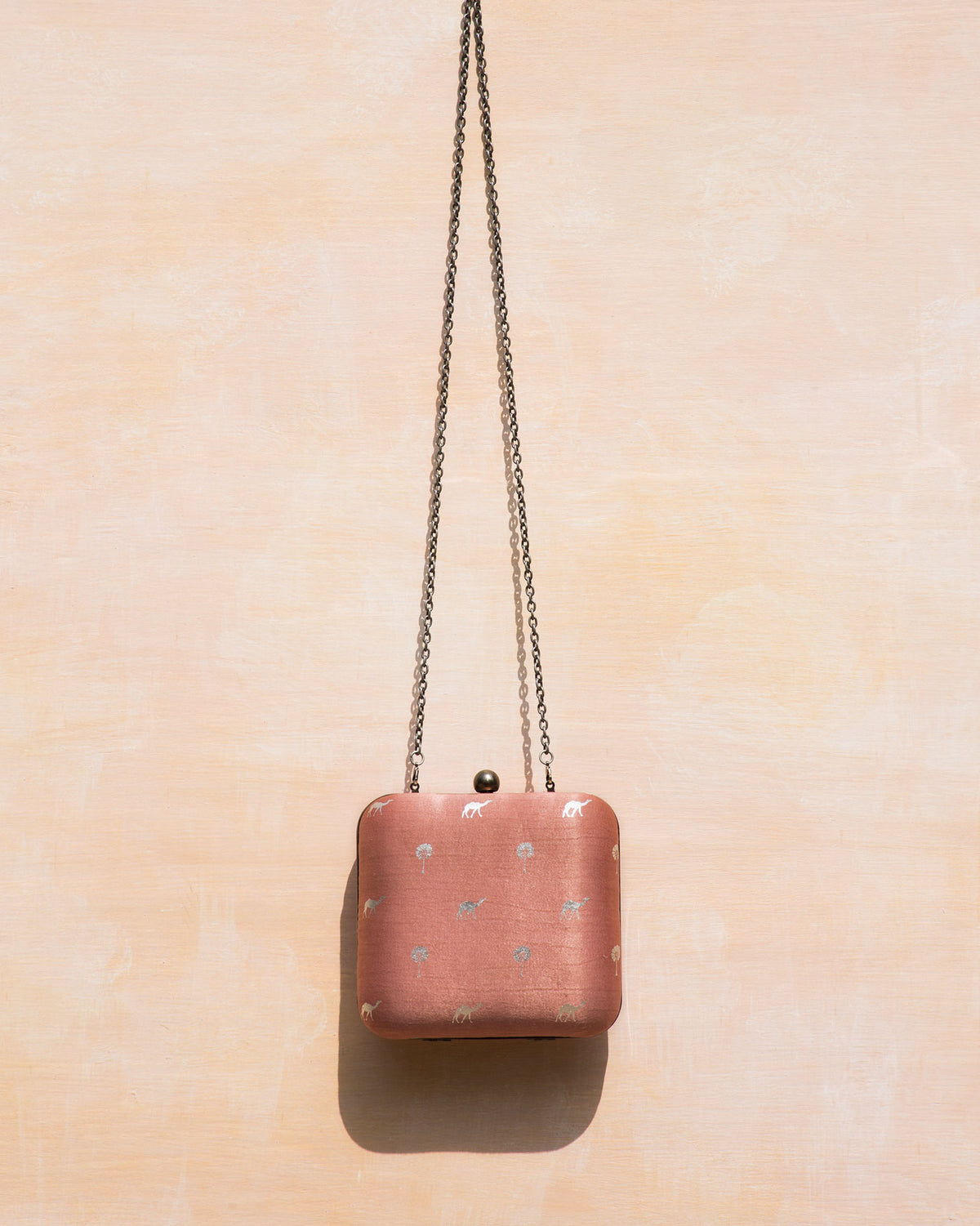 - This is a classic square clutch in smooth mashru with a contrast rose-tinted lining and a delicate silver foil print
