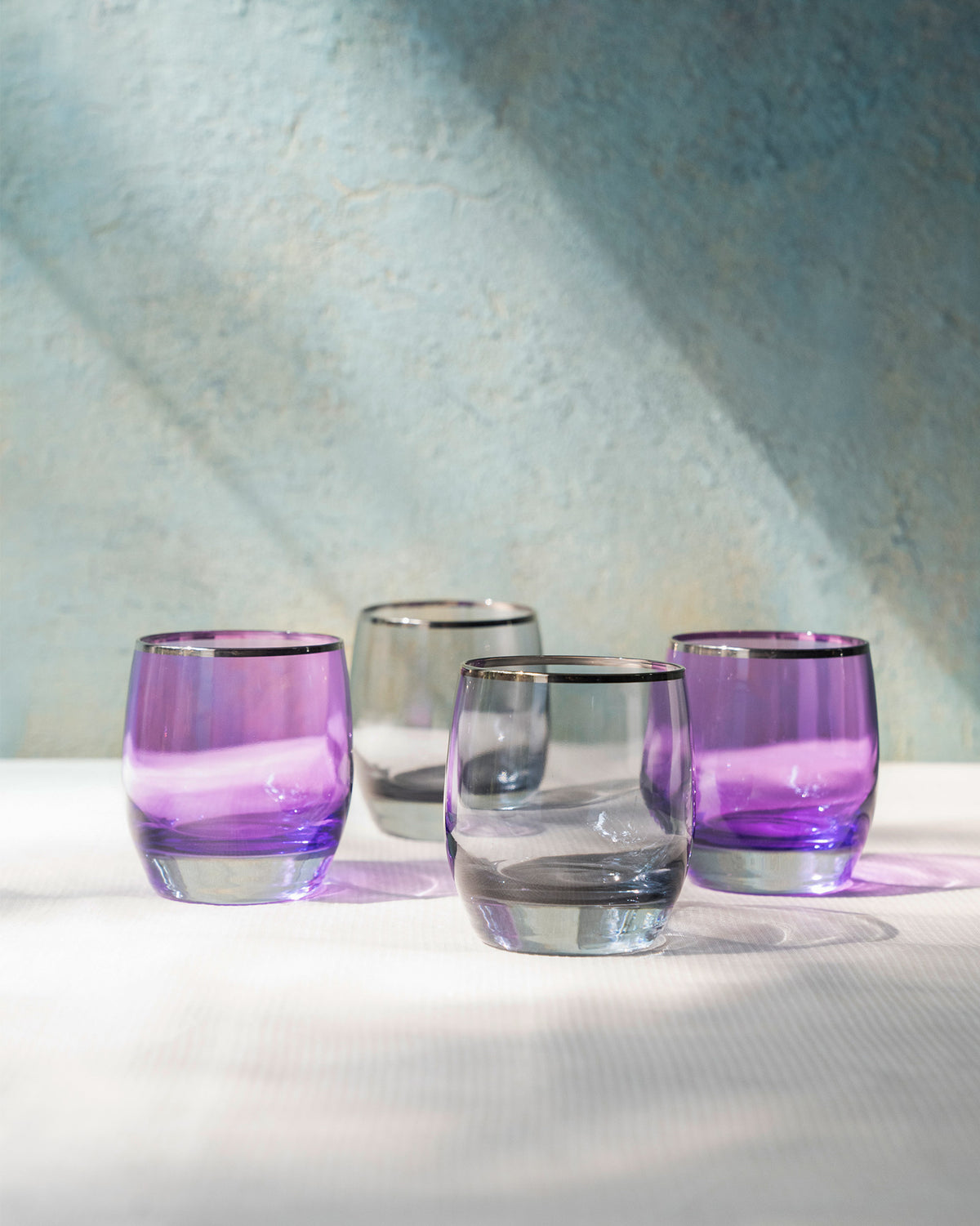 • A classic set of four glass tumblers in purple and smoke tint with a platinum rim
