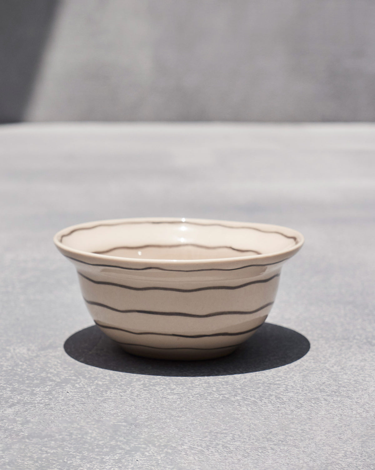 - Light ecru with grey, hand-painted irregular stripes, this stoneware katori blends seamlessly with your tableware