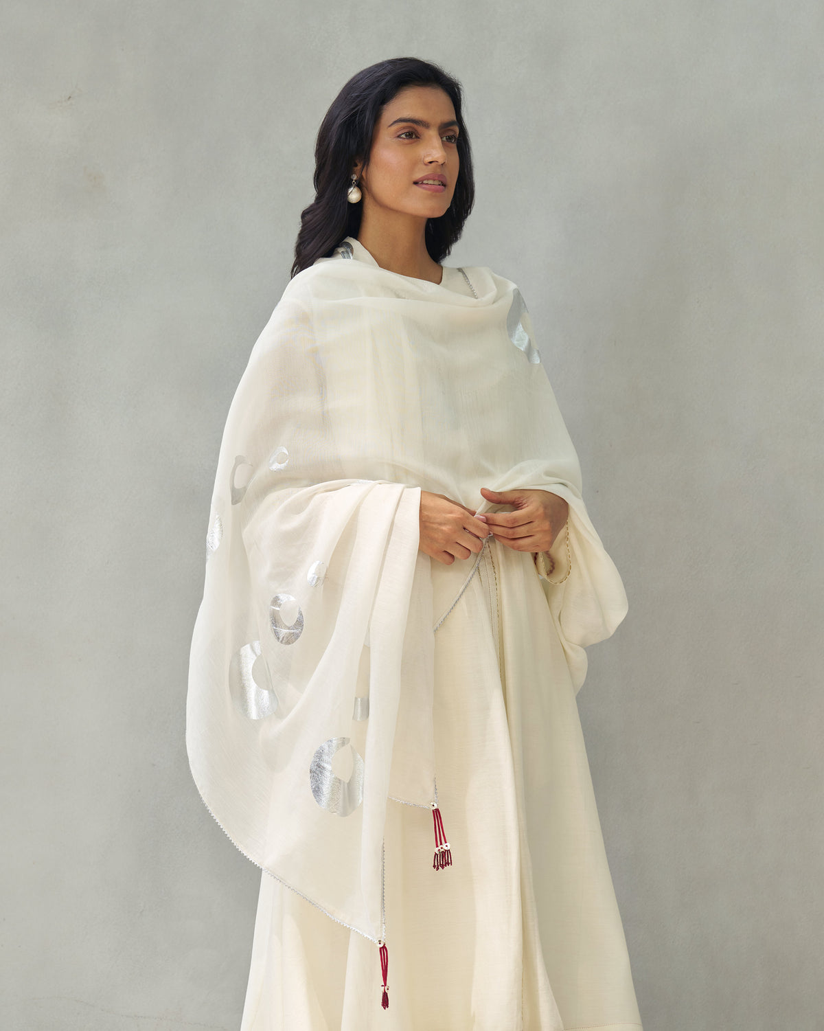 - The Chand Dupatta shines bright in delicate chanderi in ivory with silver foiled moons all over. Perfect for special celebrations.