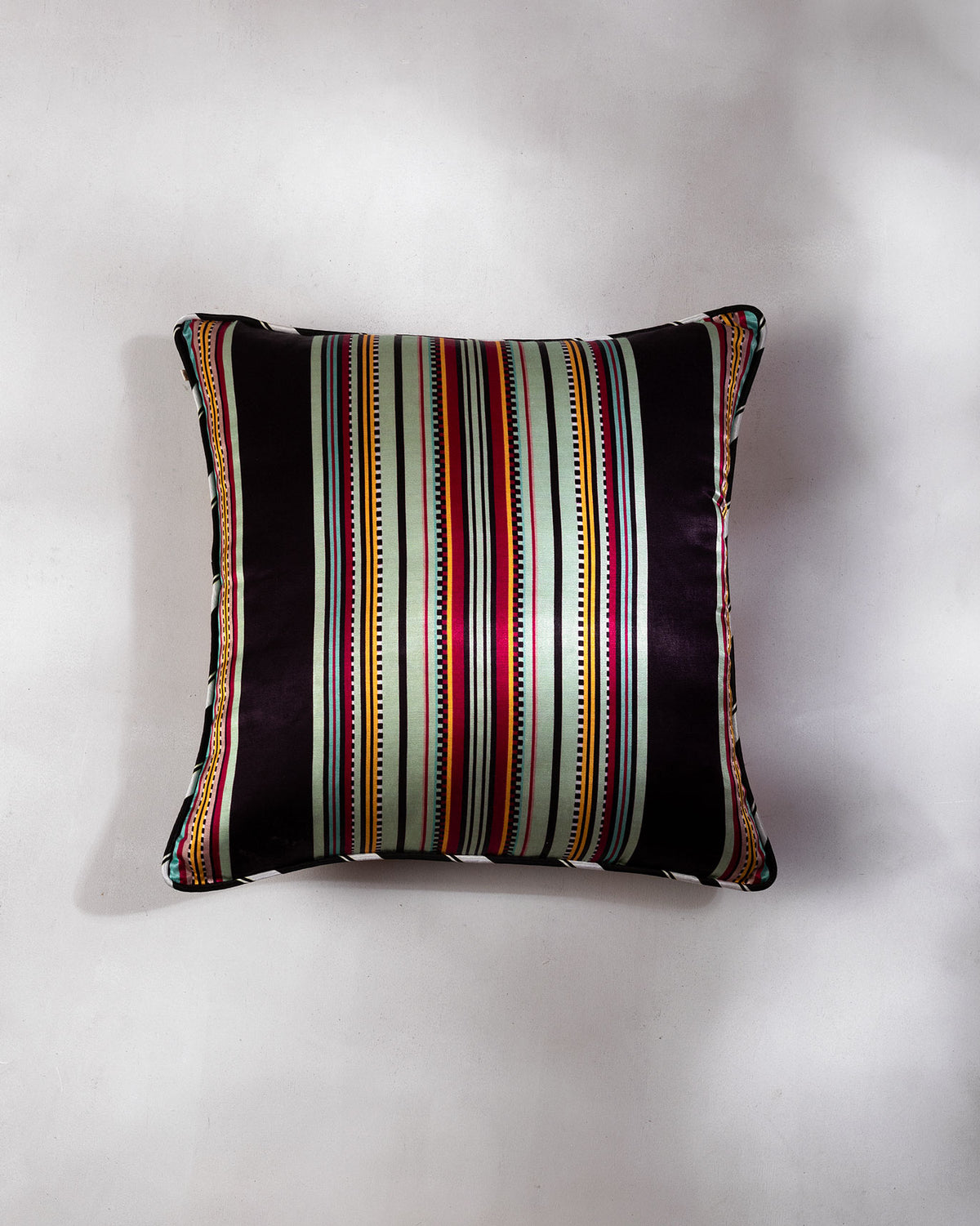 - Digi-printed on the front and back, this striped cushion in viscose mashru with monochrome piping around the corners