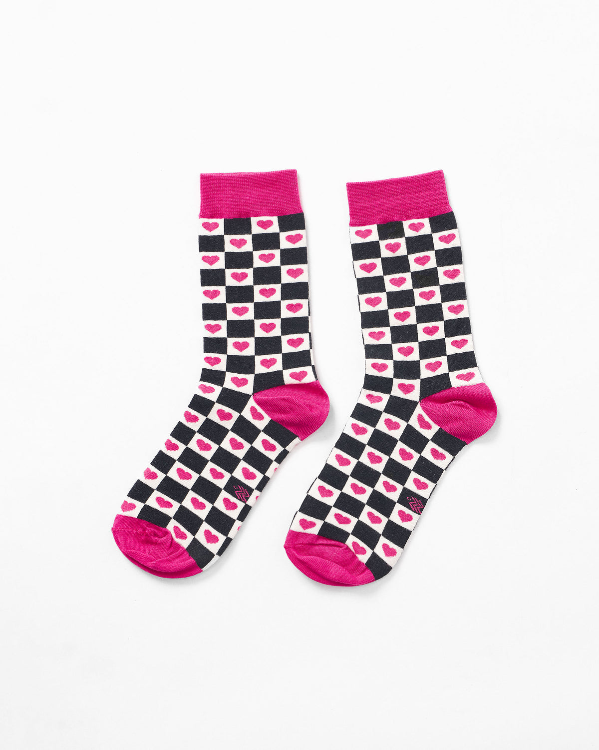 • These socks, crafted from 100% cotton feature cool, black and white checks with hearts.