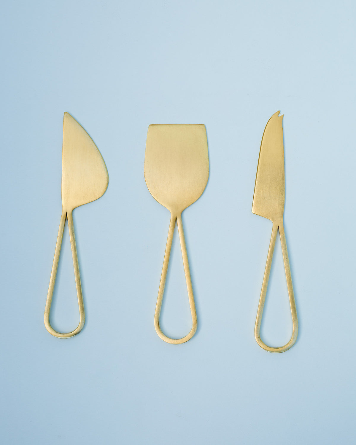 • Thin metal, finished in gleaming brass, with a two-pronged handle for style and ease, these knives come in a set of three, for soft cheeses through to hard ones.