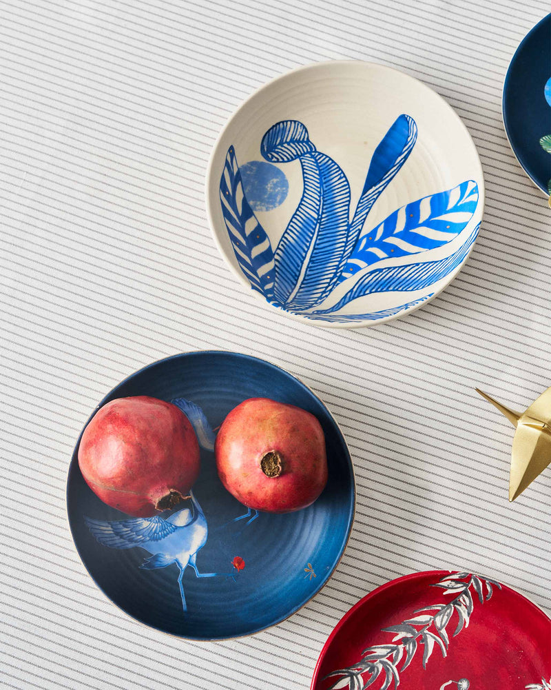 - A set of two shallow bowls featuring a pair of perched cranes and lush leaves. In Japan, the crane (tsuru) symbolises longevity, good fortune, and spiritual harmony, embodying hope and peace. Its thousand-paper-fold tradition, senbazuru, is believed to grant wishes and healing.