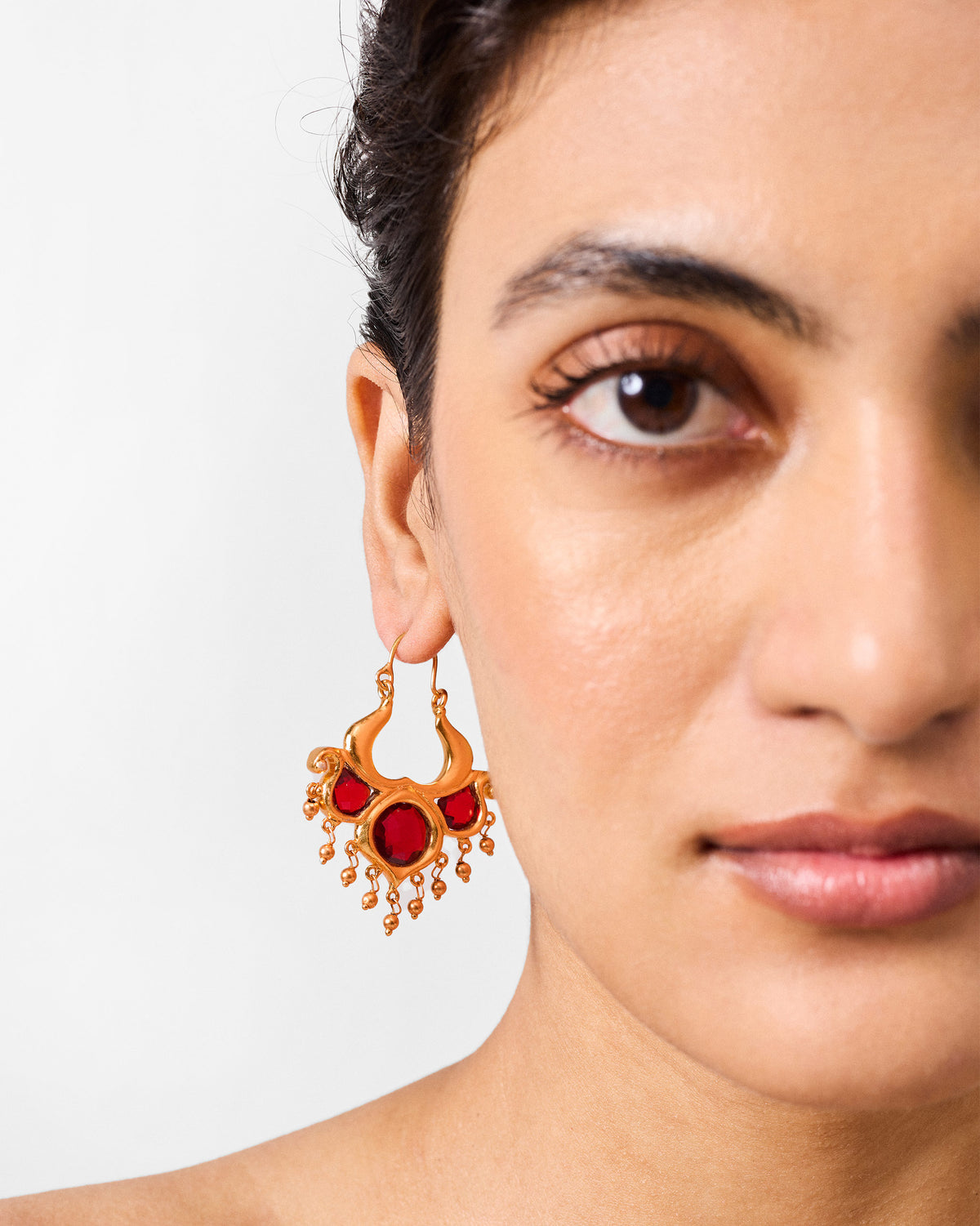 - Crafted in brass and plated in antique gold, studded with glass on both sides, a reversible heirloom-style hoop inspired by jewels seen in paintings across the subcontinent.