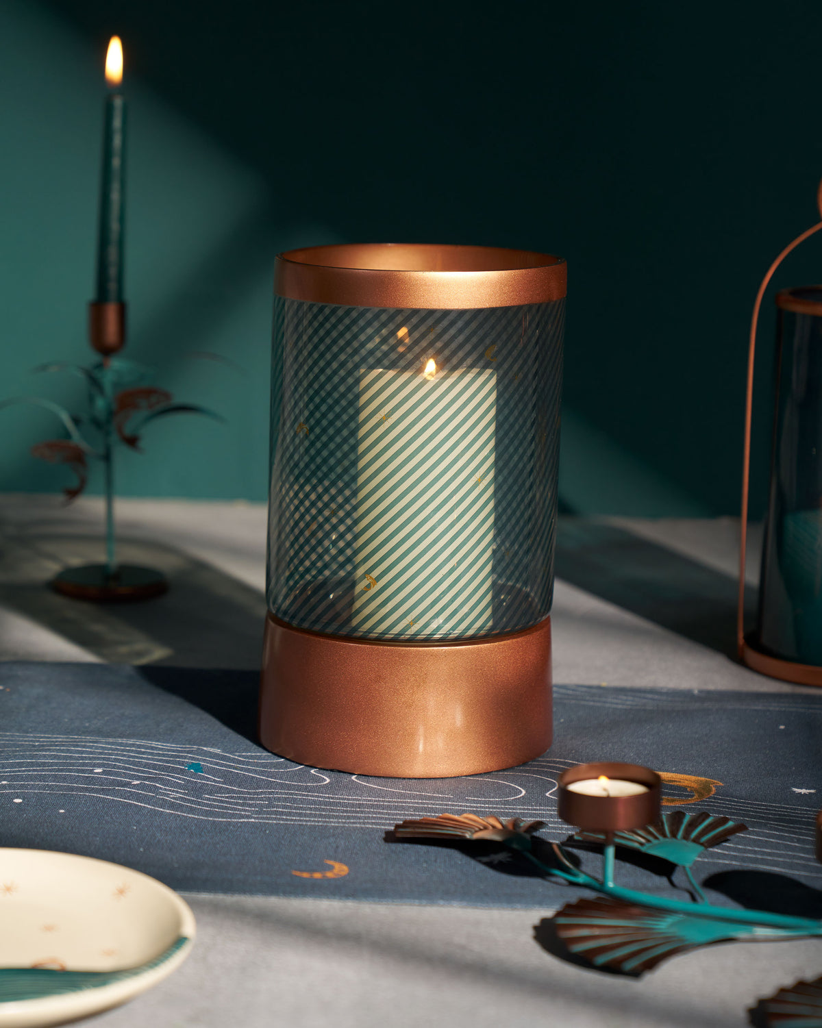 • It's lit! Liven your space with our Deco Lantern, showcasing a teal-striped glass and a copper-finished base. It offers ample space for a pillar candle. The design features celestial elements and a leaping salmon.