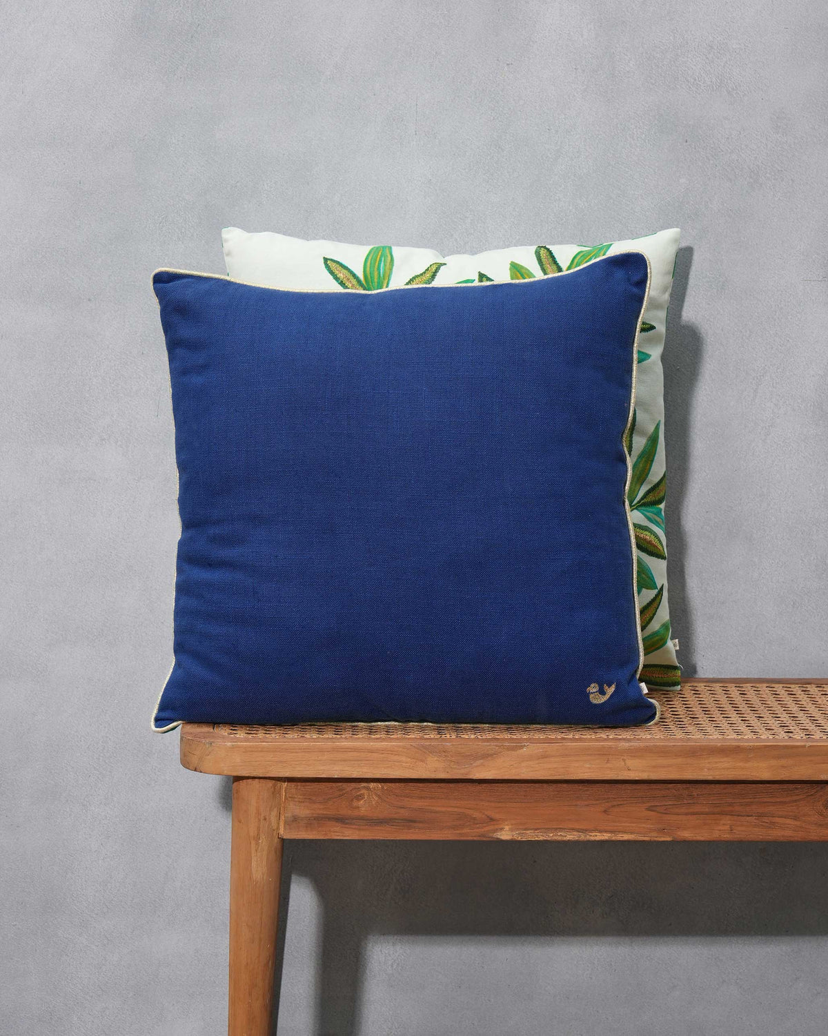 - The Desert Lagoon Cushion Cover comes in solid green and blue with a golden zari embroidered motif inspired by our travels to Morocco.