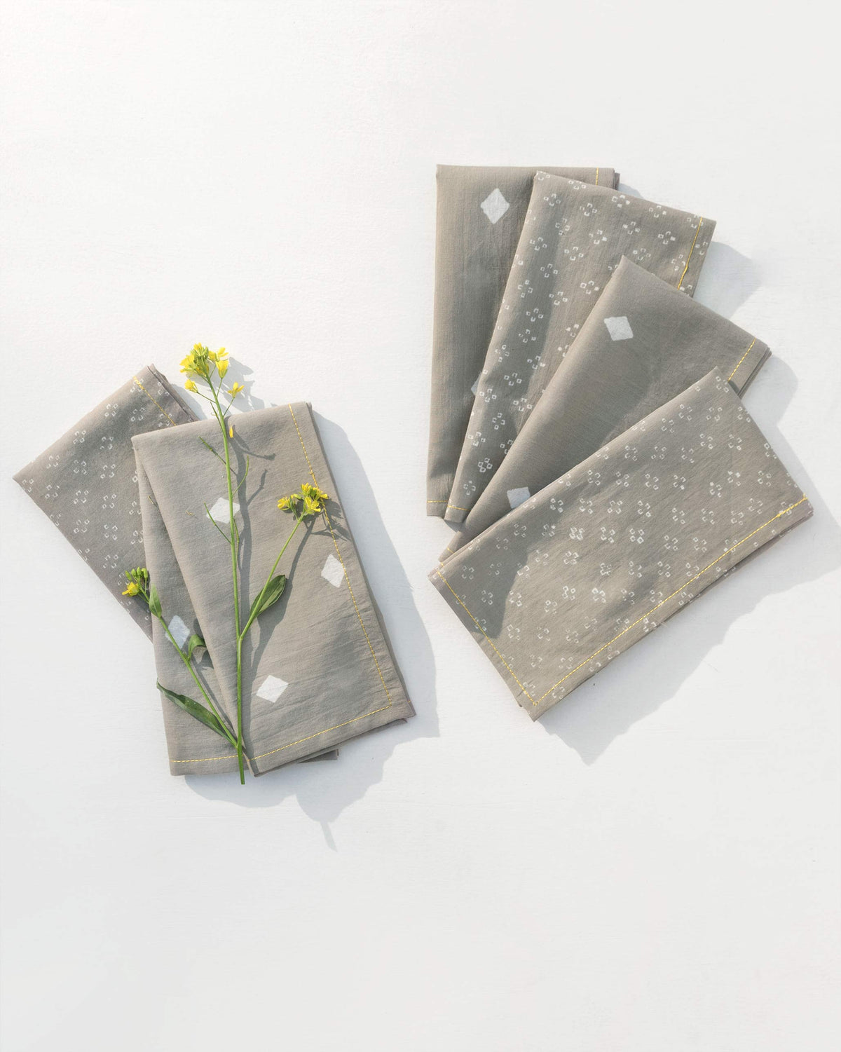 - In soft grey and white, this set of cotton dinner napkins features a yellow stitch along the edges and little diamonds, and pairs well with our recycled glass barware