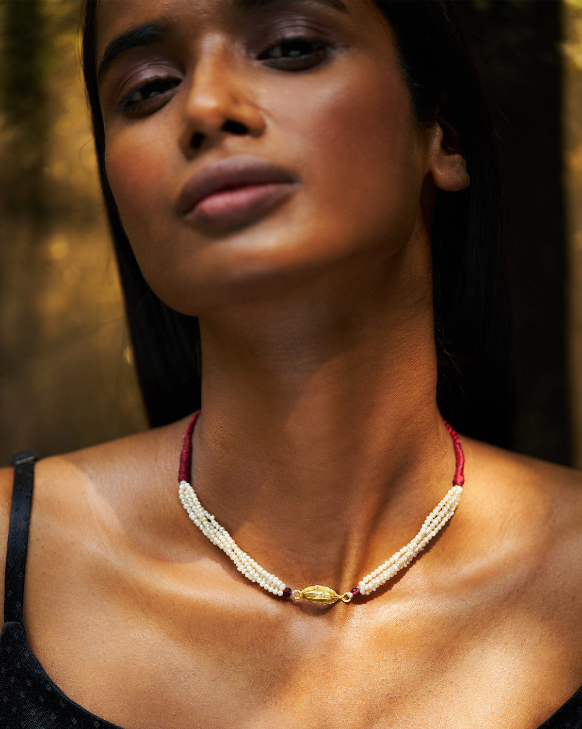 • The Elaichi Choker stands out with its exquisite and timeless design featuring freshwater Basra pearls, enhanced by garnet stones and our signature talisman elaichi. The piece is elegantly finished with cloves hanging from the ends, adding a unique touch. This piece is a continuation of our spice story, inspired by objects found around us.