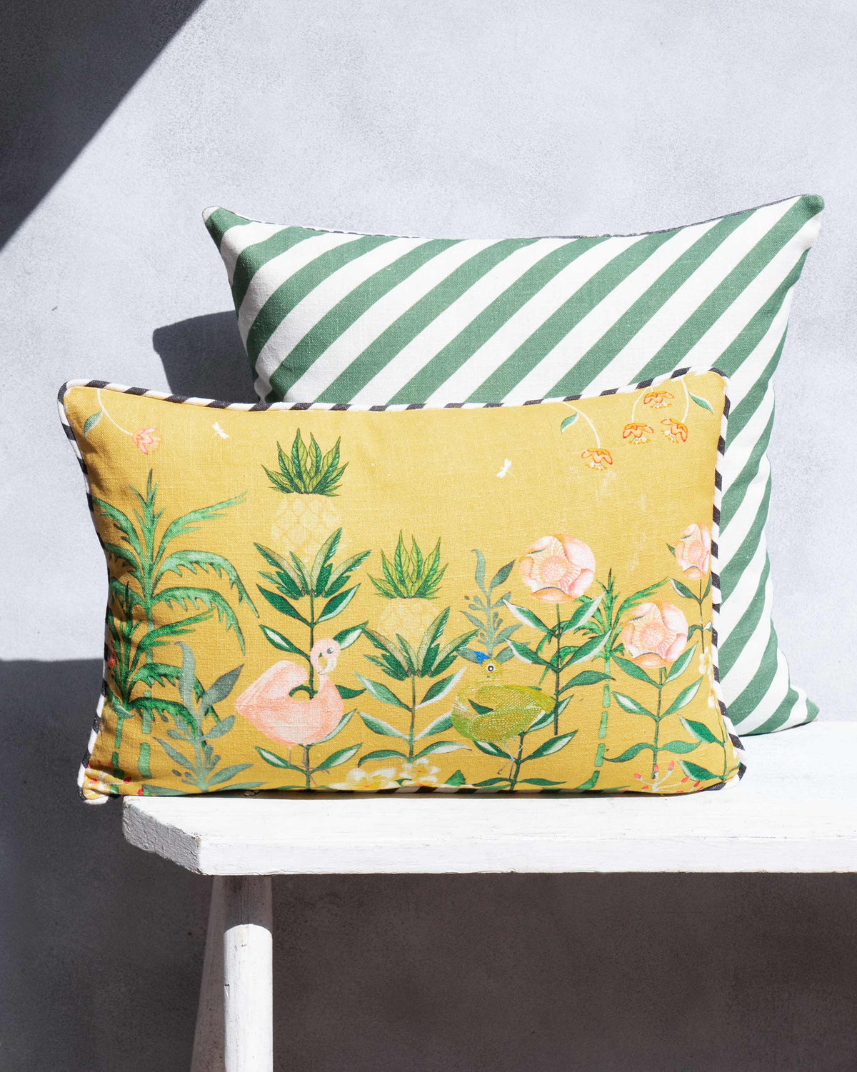 - Escape to the tropical paradise of Zanzibar with the vibrant Flamingo Cushion Cover. Featuring bright flamingos, pineapples, swaying palms and vines of pomegranates, the back of the lumbar cushion has a striped monochrome background, letting you play with the bold print or with classic stripes for your setting.