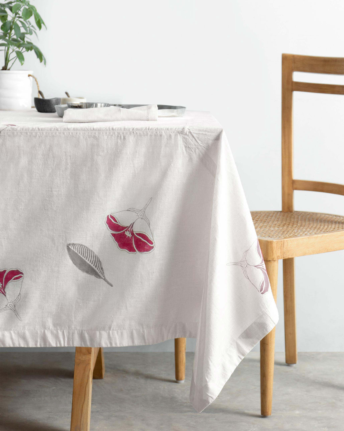 - This natural white cotton table runner is dotted with a delicate floral print.