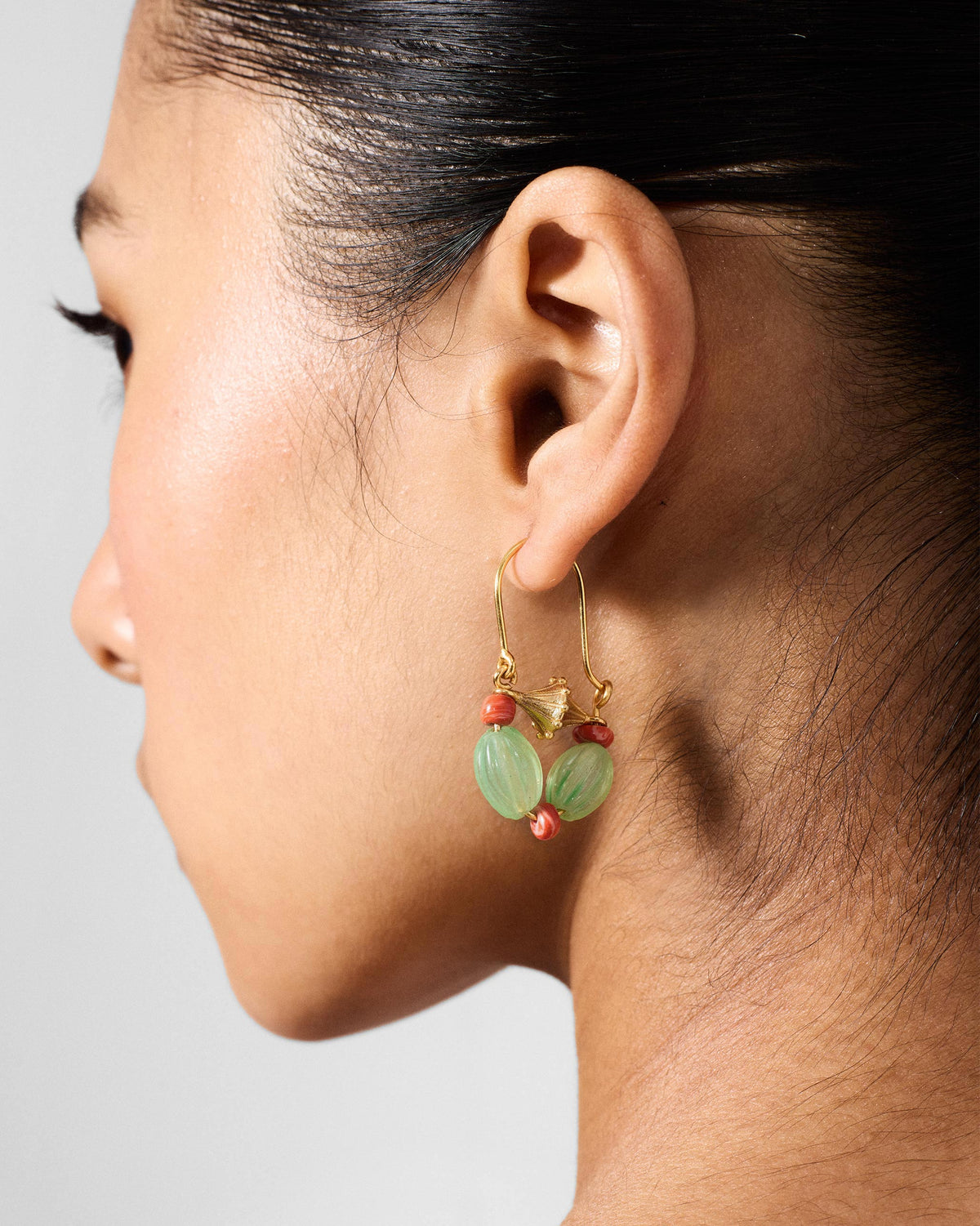 - Made in brass, gold plated, with composite corals and glass, these earrings combine visual beauty with cultural symbolism.