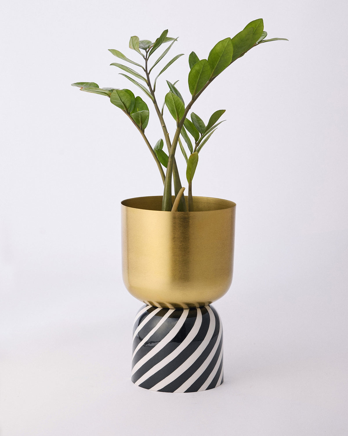 - Crafted in solid iron, the planter features a monochrome striped base and a gold-finished top.