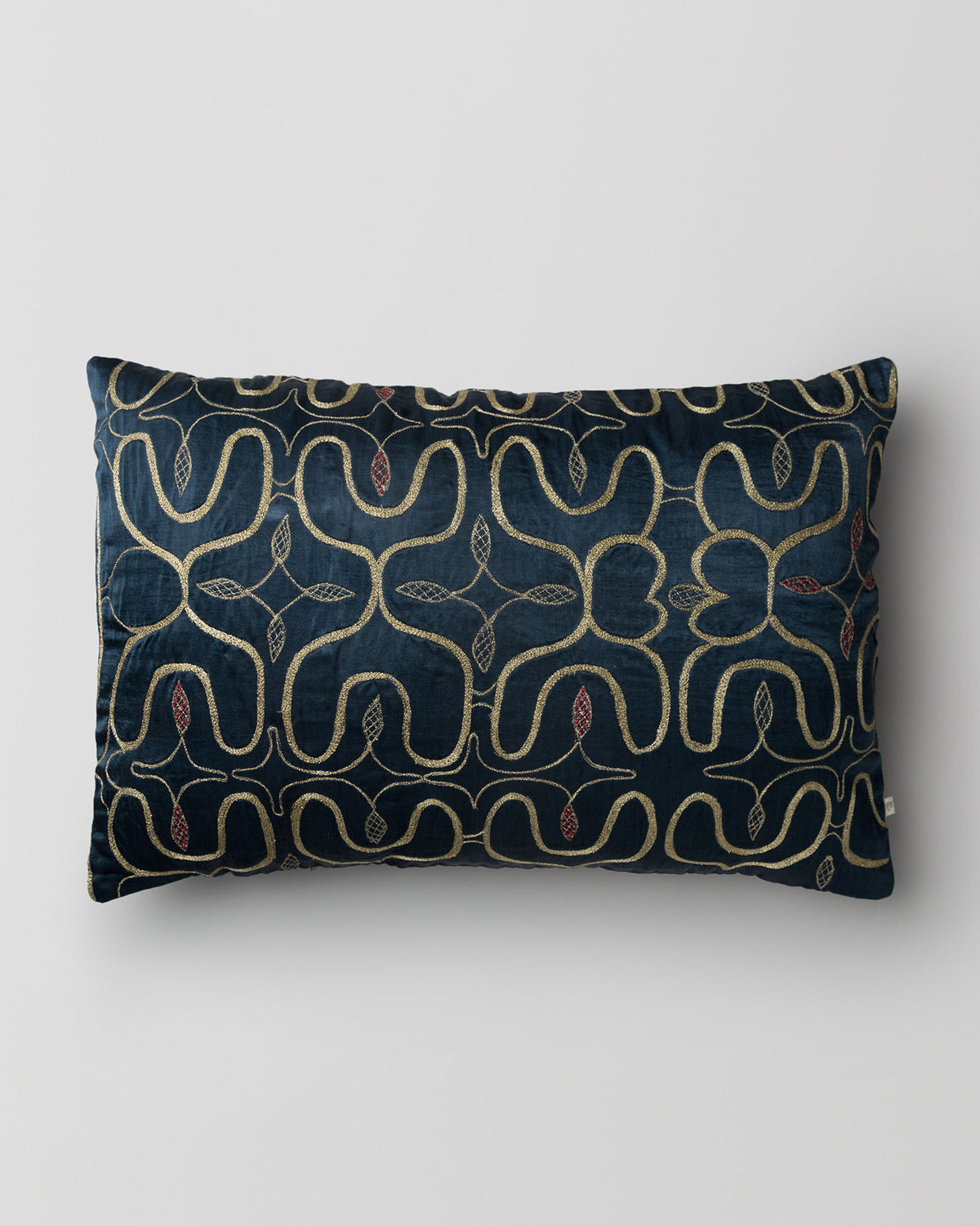 - Perfect for festivities, the piece comes in a deep midhnight blue mushru, embroidered with copper zari with hints of red thread to add a pop of bright